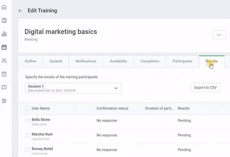 - Even if the data on users' attendance were auto-populated, you can change each learner’s attendance status manually on the Results tab.