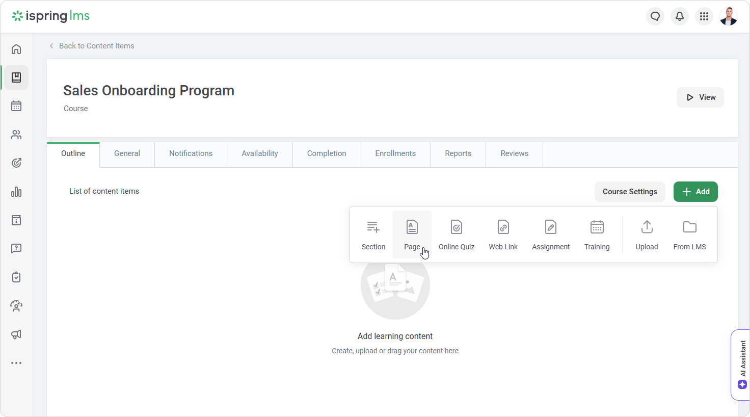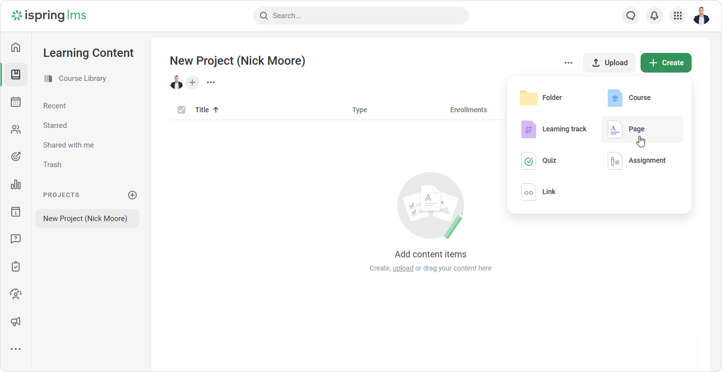 Enter a title and add content, for example, text, images, or exercises. Next, add chapters to the page.