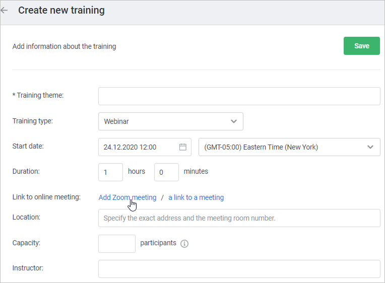 Location For a Zoom meeting, write "online." Capacity Specify the maximum possible number of training participants. If you leave the field blank, the capacity will be unlimited.