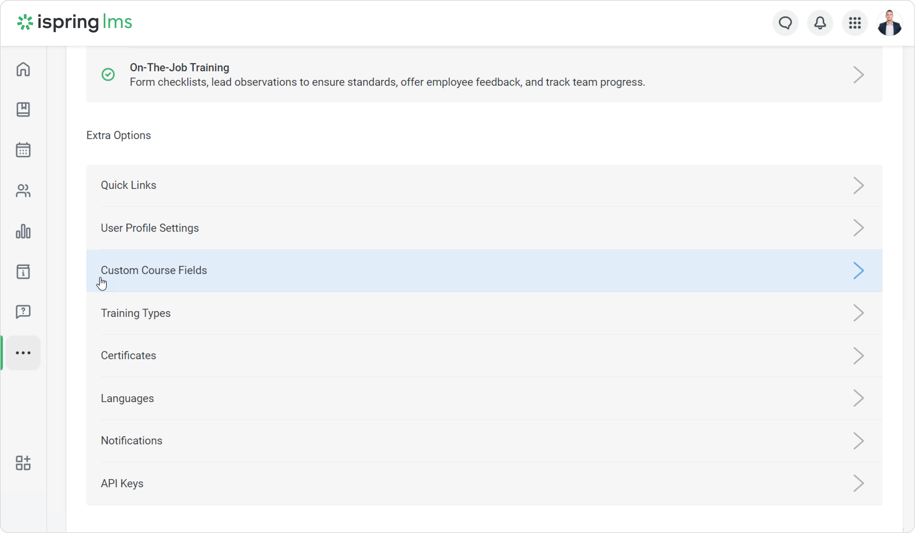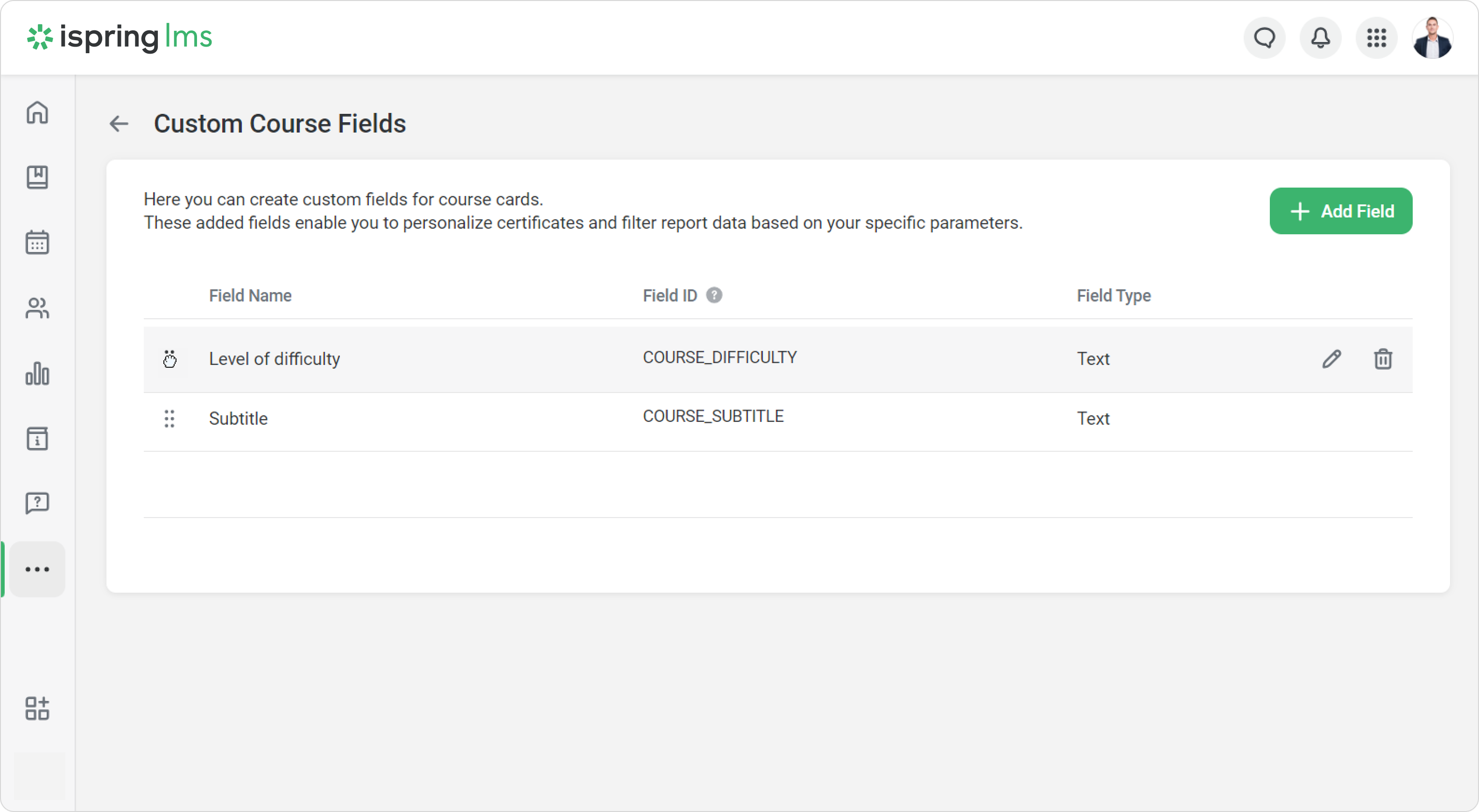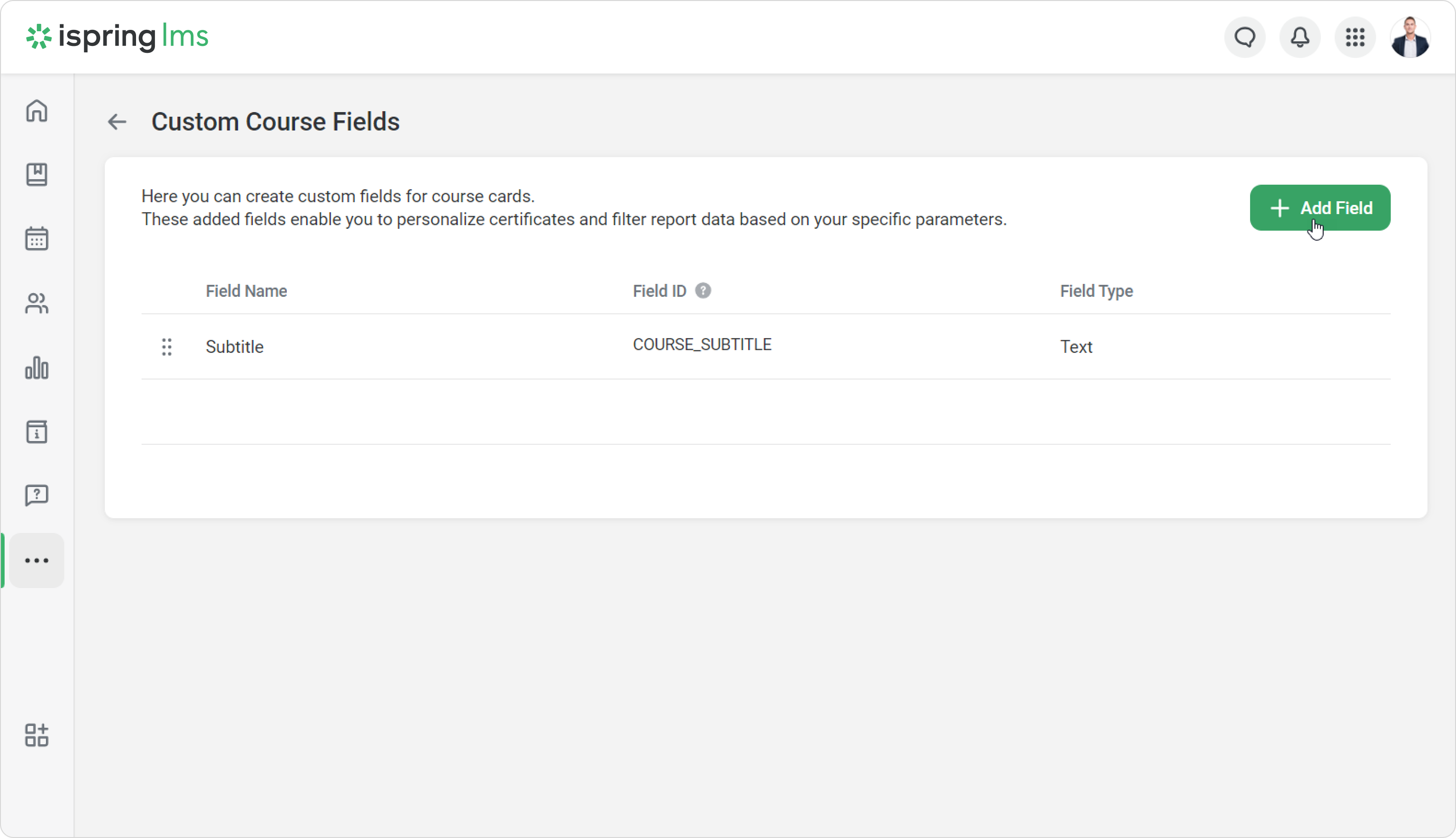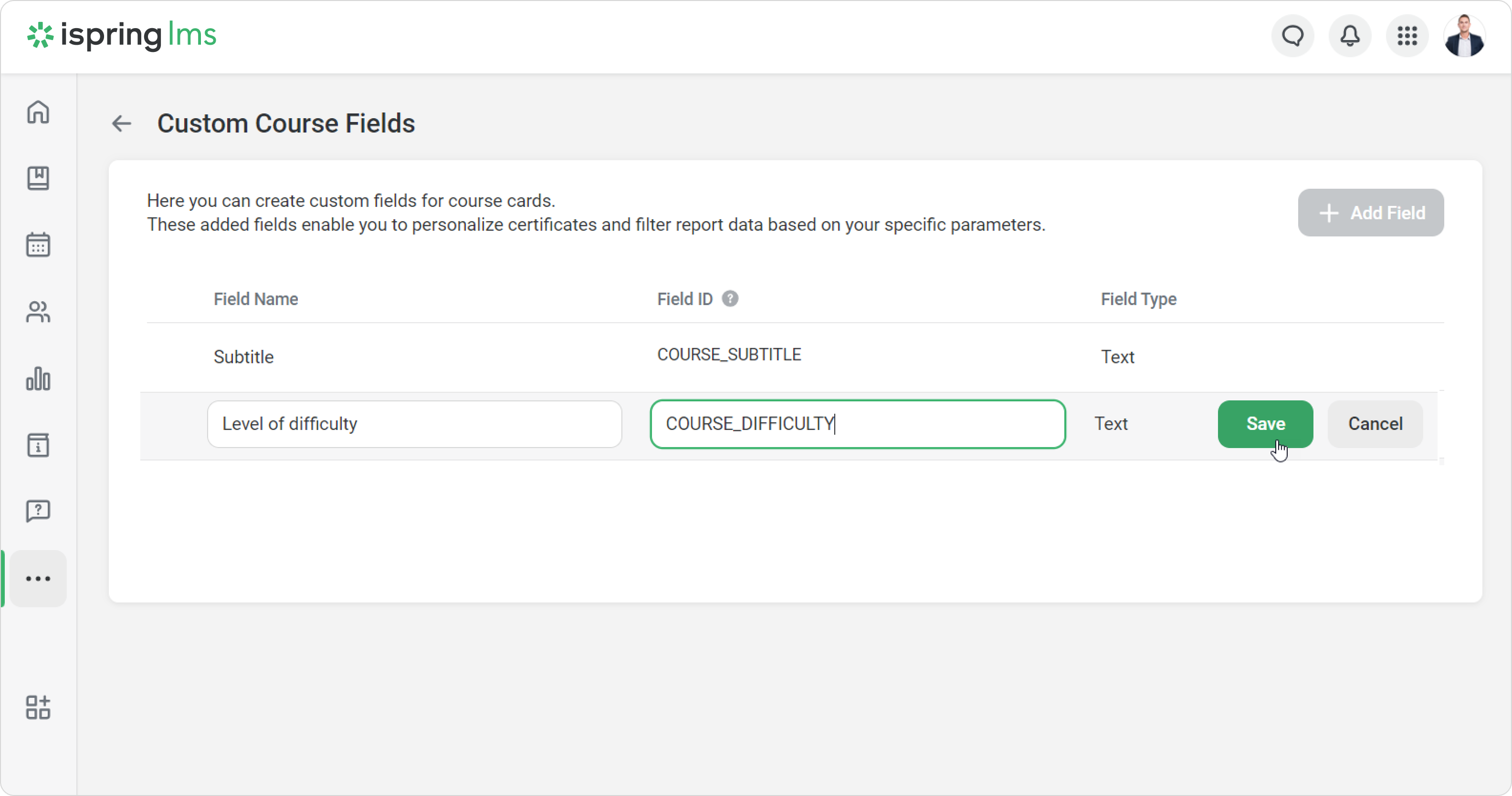 Create custom course fields so that course properties include all the necessary information about training. Custom course fields allow you to add the program name, training provider, difficulty level, and other details that will be displayed in reports and certificates.