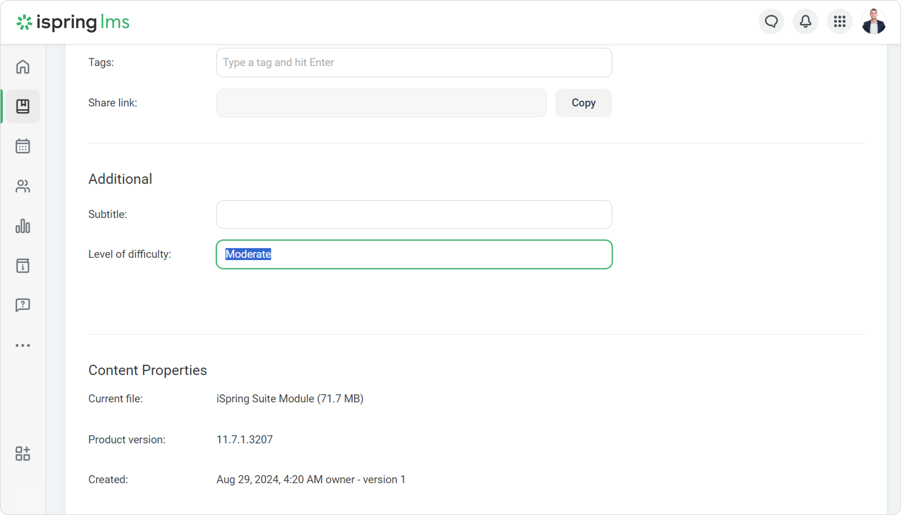 After you create a custom field in the settings, you need to fill it in for a specific course. Custom fields in course properties can be edited by Course Authors.