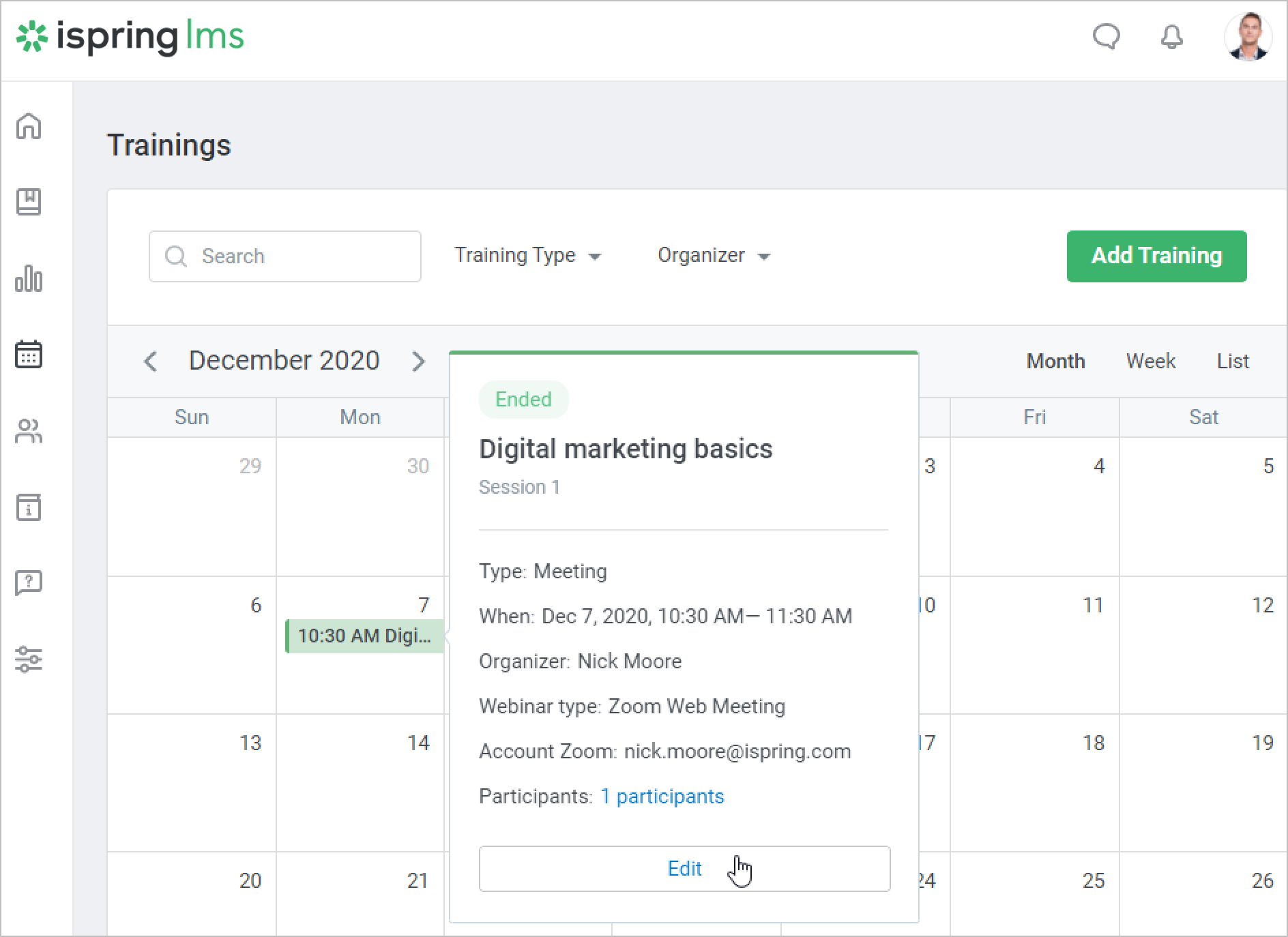 - Go the Trainings section, locate a training in the calendar, click on it, and hit the Edit button in the window that appears.