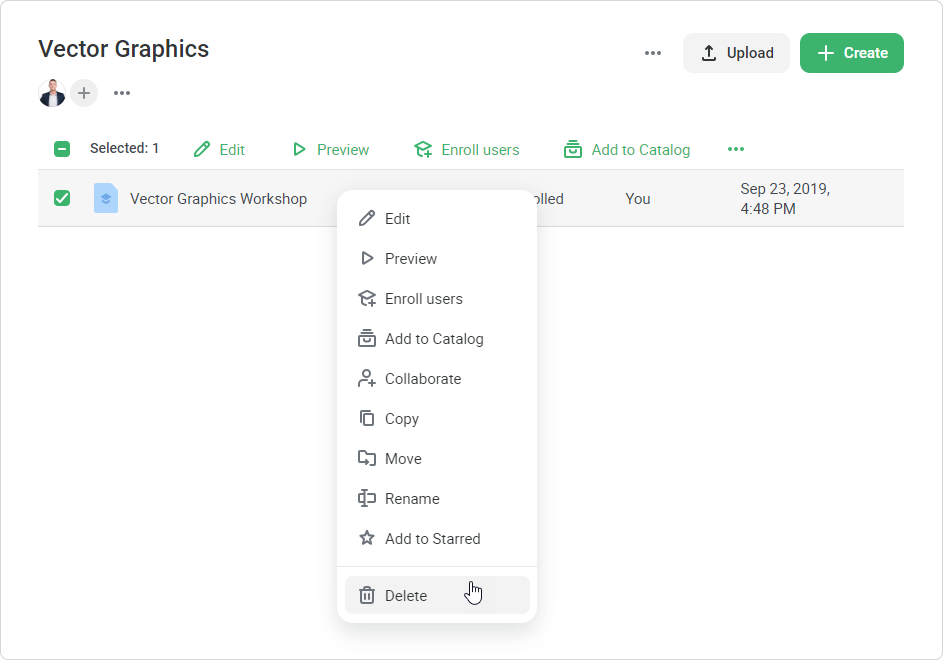The first way is to check a course or multiple items and click Delete in the top menu.