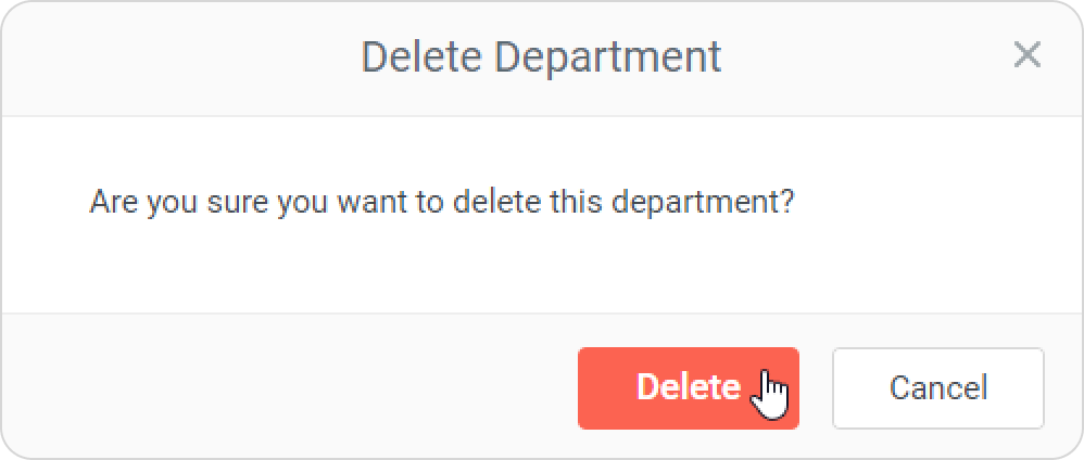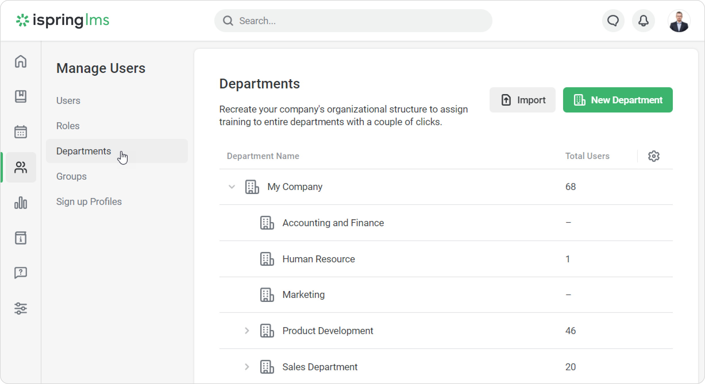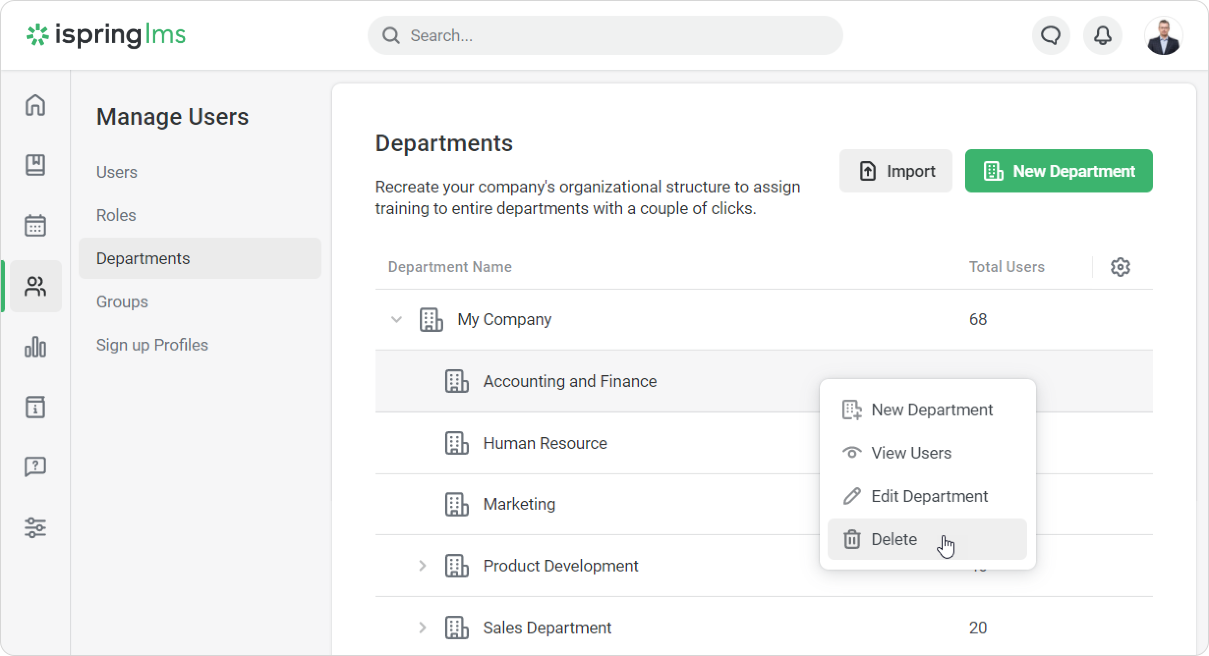 iSpring LMS Users Managing Departments Current: Deleting Departments Deleting Departments To delete a department:Open the Users section and select the Departments tab.Select the department you would like to remove and right-click on it. Then, choose Delete in the context menu. In the Delete Department window, click Delete to confirm.Removal is not possible if:there are users in the department or its daughter departments;the department is managed by another user;the department is the root one. If you delete a parent department, all its daughter departments will be deleted, too. ×
