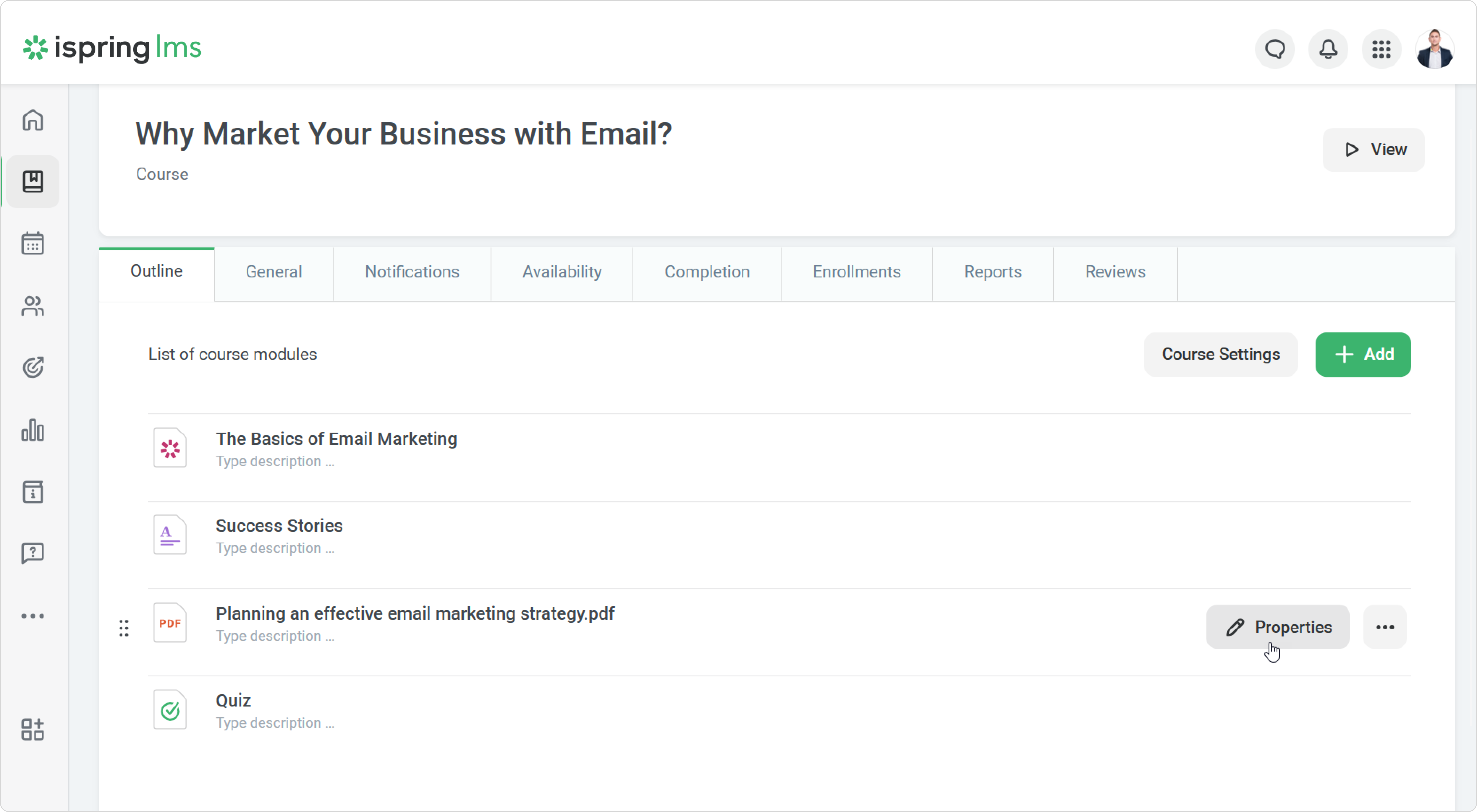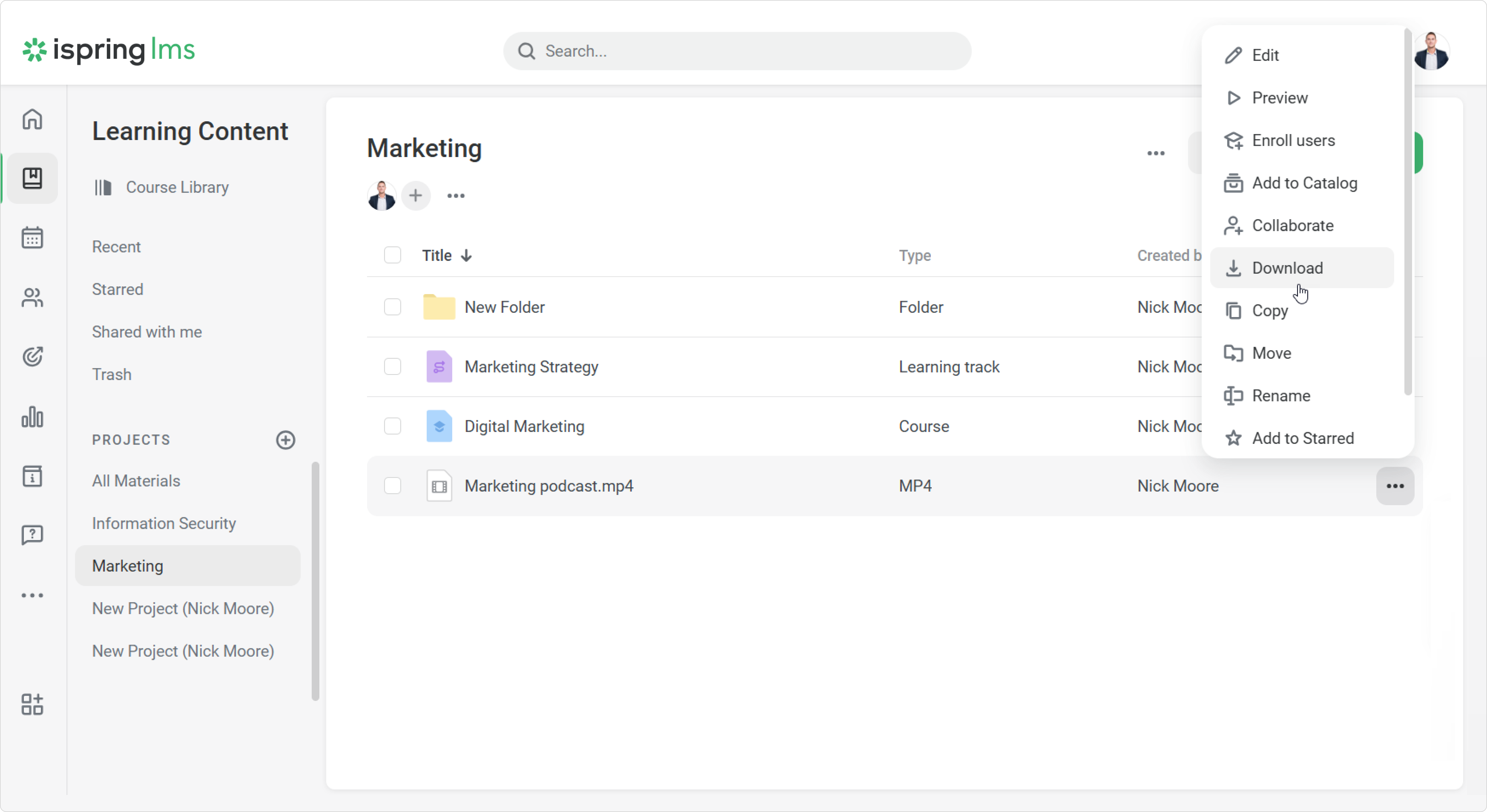 This way, even if you lose the original files, you can always download them again from iSpring LMS.