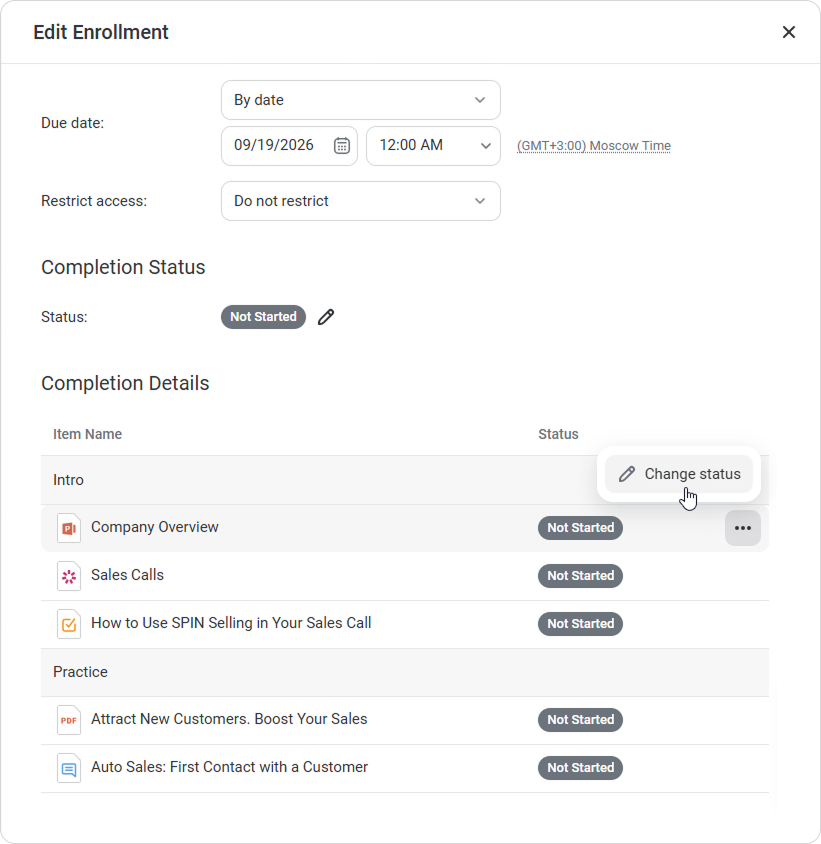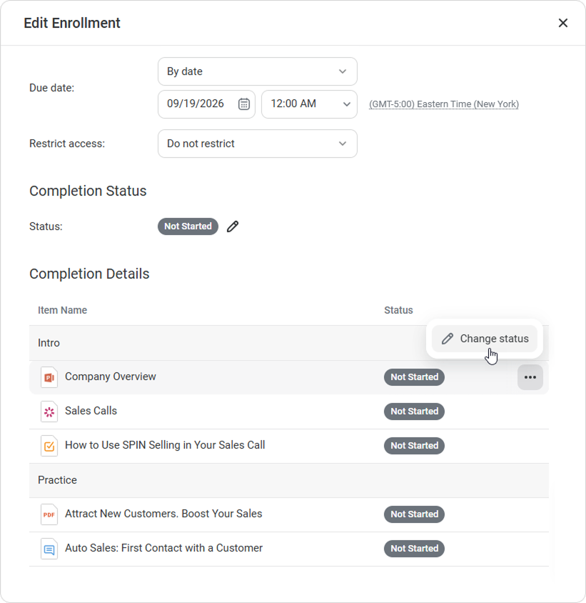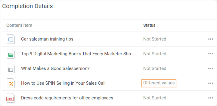- In the Completion Details section, select a content item you want to edit the status for and click on the ellipsis next to it. In the menu, choose Change status.