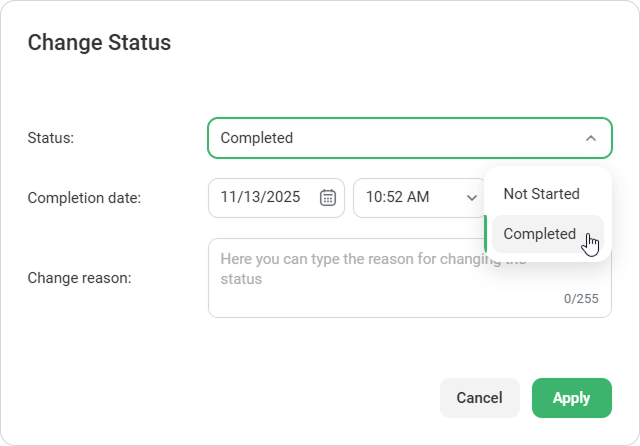 Specify the completion date and the reason for editing the status, and click Apply.- If the content item is evaluated (it could be a quiz, a dialog simulation, or an assignment), enter the number of scores earned.