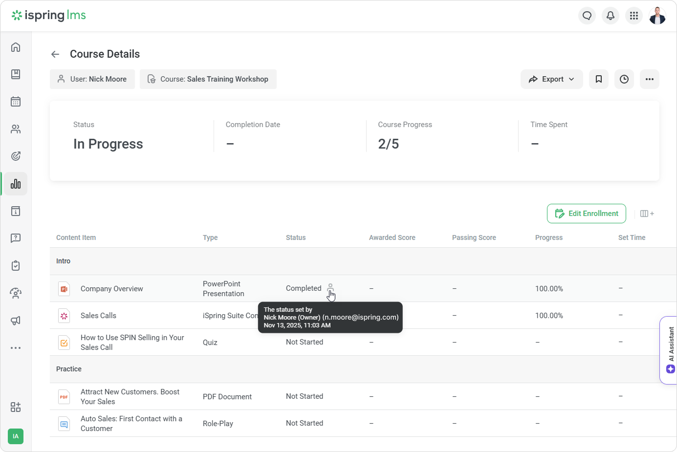 This can occur when a learner already completed the content item as part of another course or taken it offline, outside of their iSpring LMS account. In this case, the administrator can manually set the content item status to Completed, Passed, or Failed. This prevents the learner from repeatedly seeing the same content item and ensures that their completion is accurately reflected in reports.