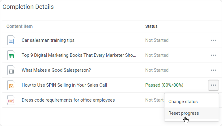 - If needed, you can always edit the content item status to Not Started with the Reset progress option.