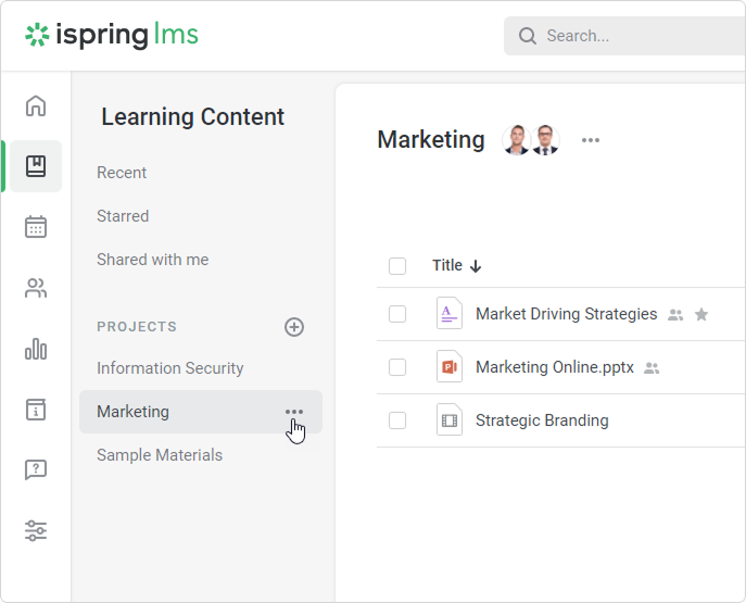 iSpring LMS Learning Content Projects Current: Editing a Project Editing a Project You can change the title of the project, participant list and give team members access to a project in the Manage Project window.Click ••• next to the project name.In the Manage Project window, make the desired changes and click Done. ×
