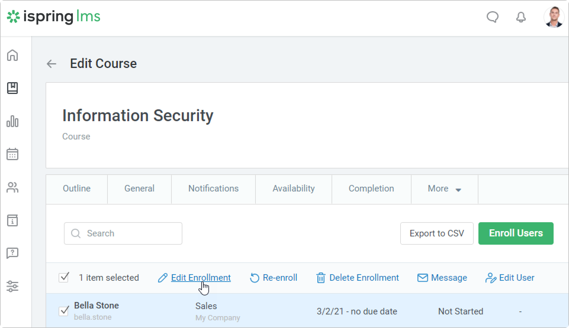 You can change the enrollment parameters of a course at any time after it has been created. This option can be useful if you want to give users more time to complete the course, or if you need to delay the start date for the course.