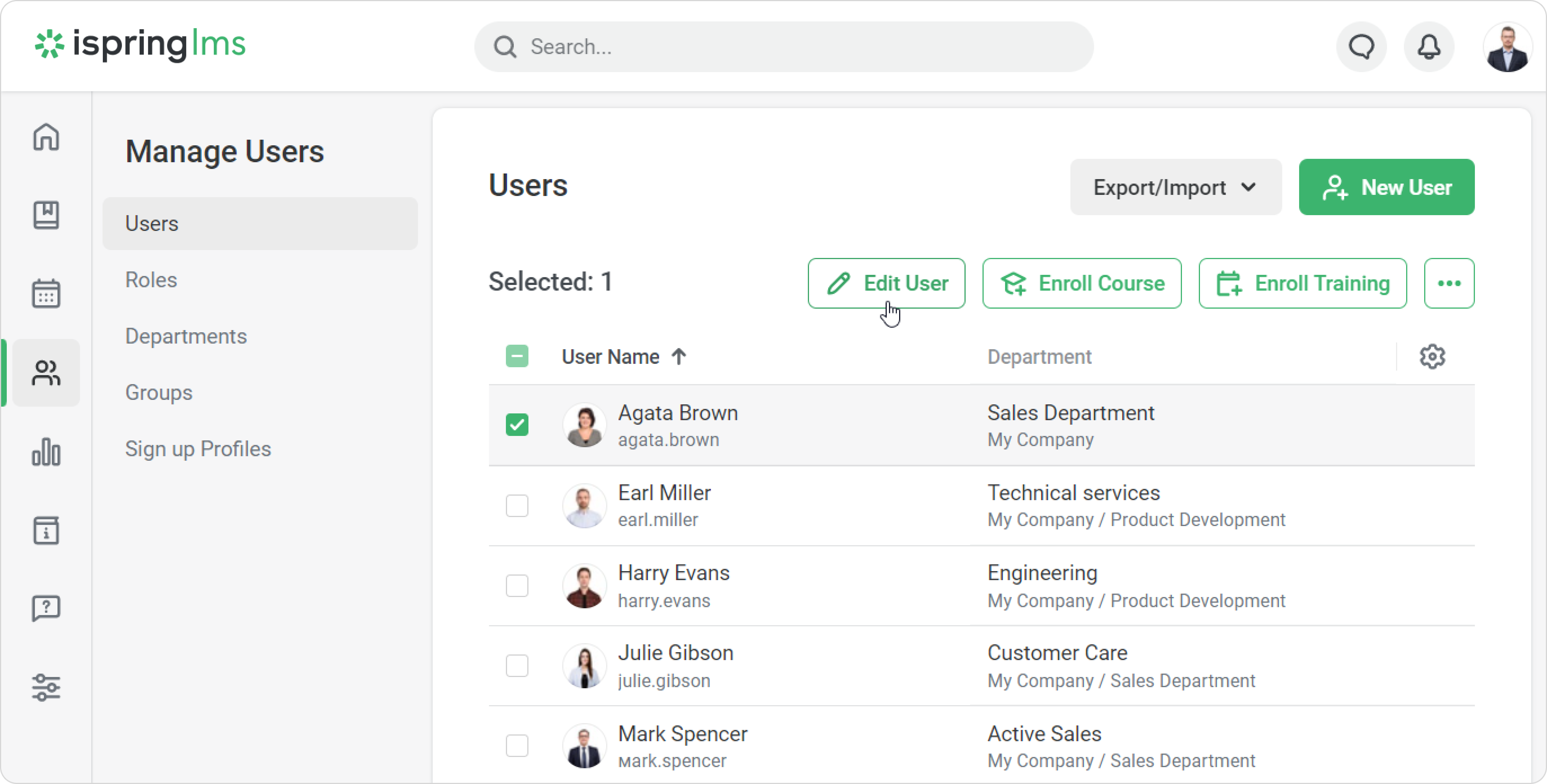 iSpring LMS Users Managing Users Current: Editing Users Editing Users On the Edit user page, the following actions are available: To proceed to the Edit User page, click on the user's name in the list.Or you can use the context menu. Just right-click on the user's name in the list and select Edit User. ×