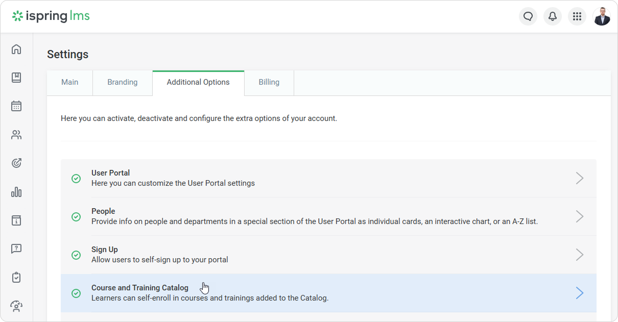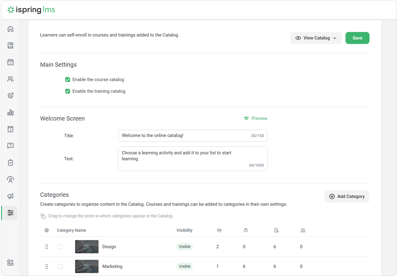 iSpring LMS Settings Additional Options Catalog Current: Enabling Course and Training Catalog Enabling Course and Training Catalog Go to Settings > Additional Options and select Course and Training Catalog.On the opened page, enable and disable the course and training catalogs, change the welcome text, and manage the categories.Enable the course catalogEnable or disable the course catalog in the account. It is turned off by default.Enable the training catalogEnable or disable the training catalog in the account. It is turned off by default.Welcome ScreenEnter the welcome screen title and text. Learners can see the welcome screen when they open the course or training catalog for the first time.Click Preview to check how the welcome screen will look to learners. The Welcome Screen and Categories are the same for the course catalog and the training catalog.If you are not satisfied with the default catalog cover image, you can add a new one. ×