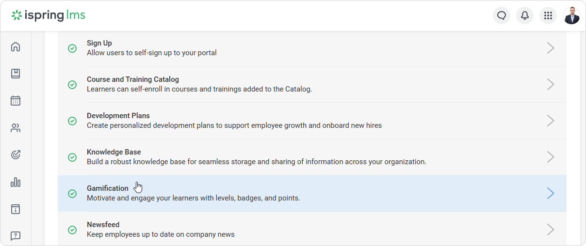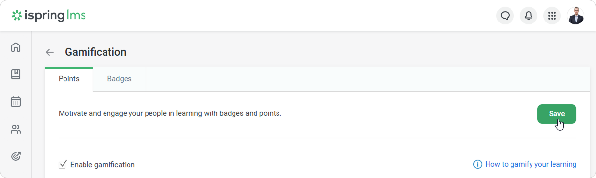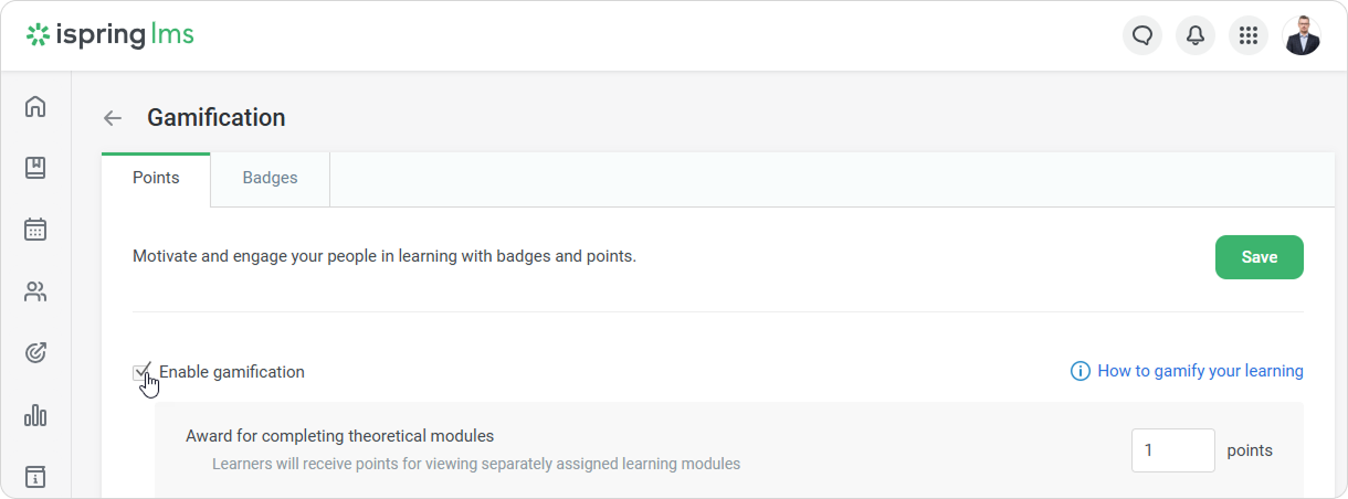 iSpring LMS Settings Additional Options Gamification Current: Enabling Gamification Enabling Gamification To enable gamification:Open the Settings section, click the Additional Options tab and select Gamification.Select Enable gamification and specify how many points learners will receive for different content types.Finally, click Save. ×