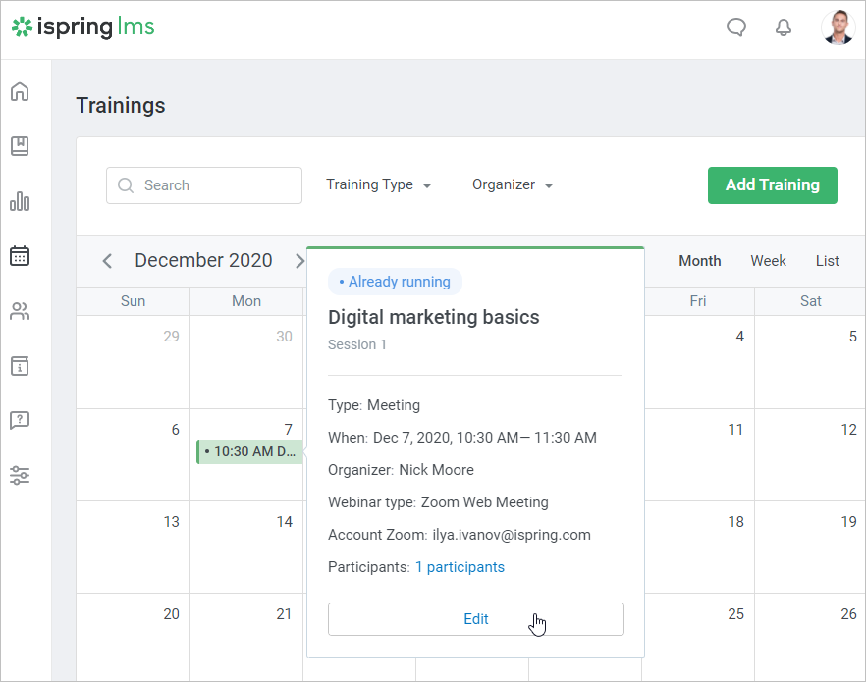 - The end of a meeting in Zoom and iSpring LMS are synchronized. If you end a meeting in Zoom, it will be concluded in iSpring LMS, and vice versa.
