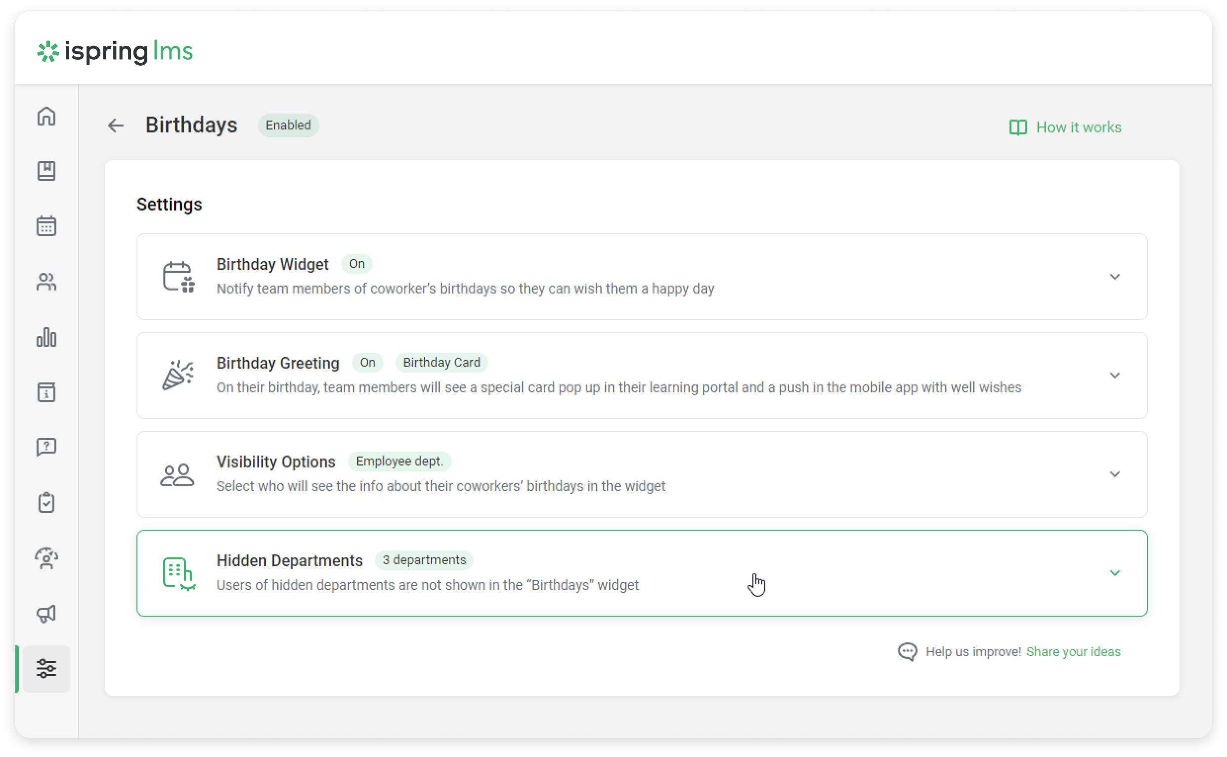 In iSpring LMS, account administrators can choose who sees birthdays: the entire company or only those in the same department as the person having a birthday. You can also hide the birthdays of employees in specific departments for the sake of confidentiality. This is useful if a company has several branches and a large number of employees.