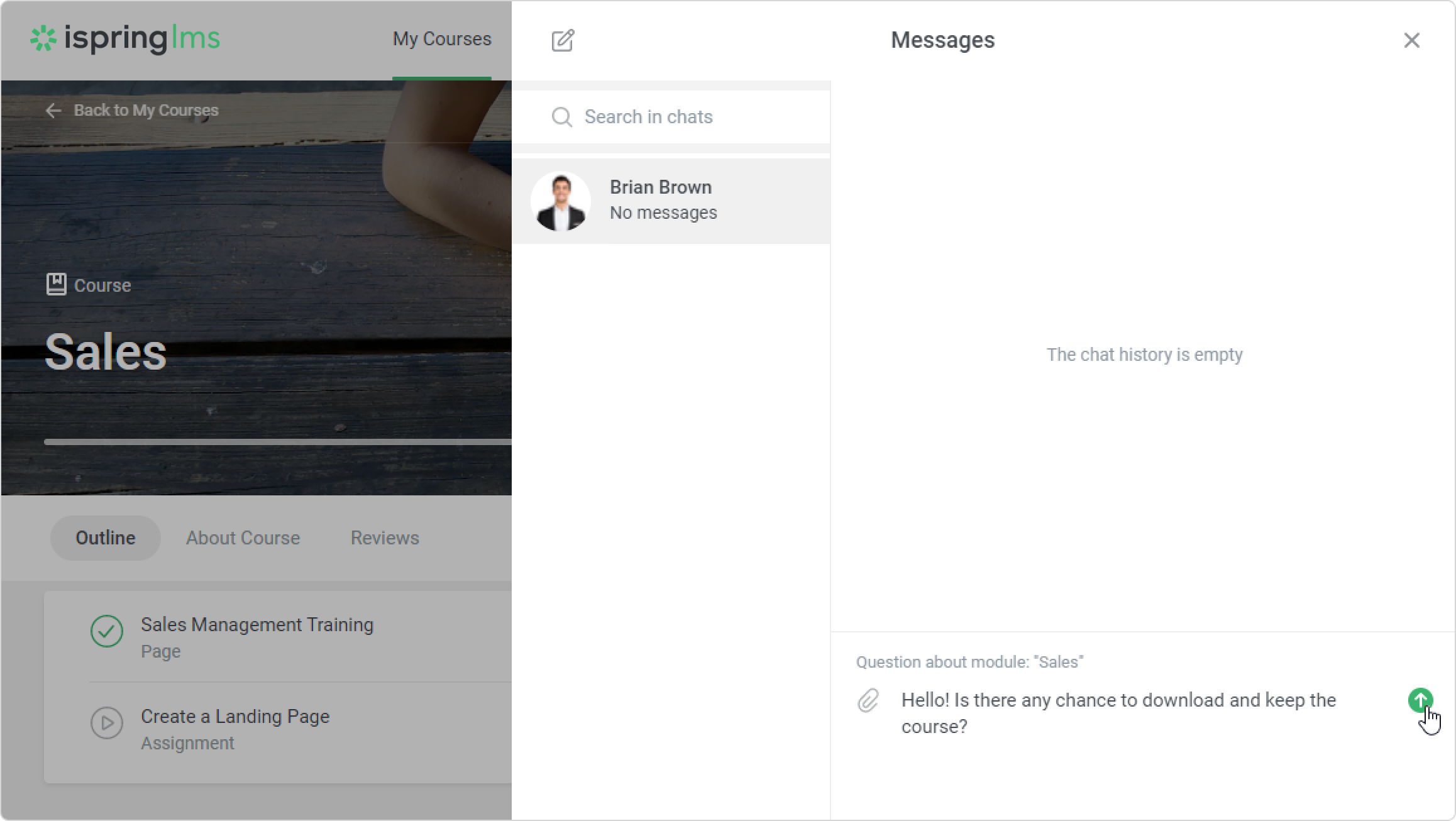 iSpring LMS Users Instructors Current: Exchanging Messages with Instructor Exchanging Messages with Instructor Users can send messages to instructors and receive feedback from them. To contact an instructor, click the Contact instructor link. Make sure that private messaging is enabled in the User Portal Settings. On the Messages page, type your message for the instructor and send it.The instructor will see a notification about a new message in their account. If the instructor is deleted from the content item, removed from the account, or deactivated, the correspondence history will also remain.If a question has been asked through the Questions and Answers tab, the instructor will see a notification in their account. ×