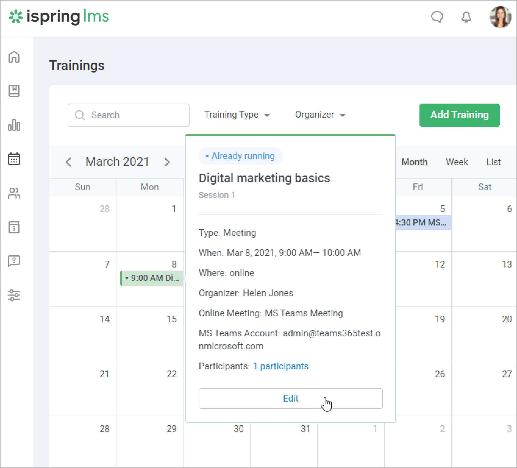 - Go to the Trainings section, locate the meeting in the calendar, click on it, and hit the Edit button in the appeared window.
