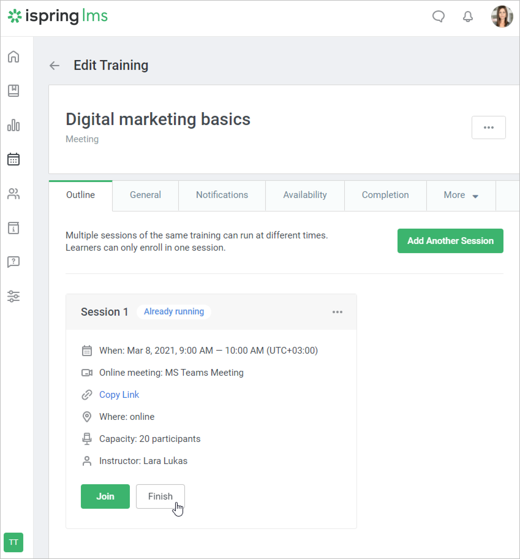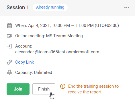 • 24 hours after the meeting's start date - Clicking on the Finish button doesn't actually finish the meeting in Microsoft Teams but becomes an endpoint for collecting stats (participation duration) that will appear on the Results tab and in iSpring LMS reports.