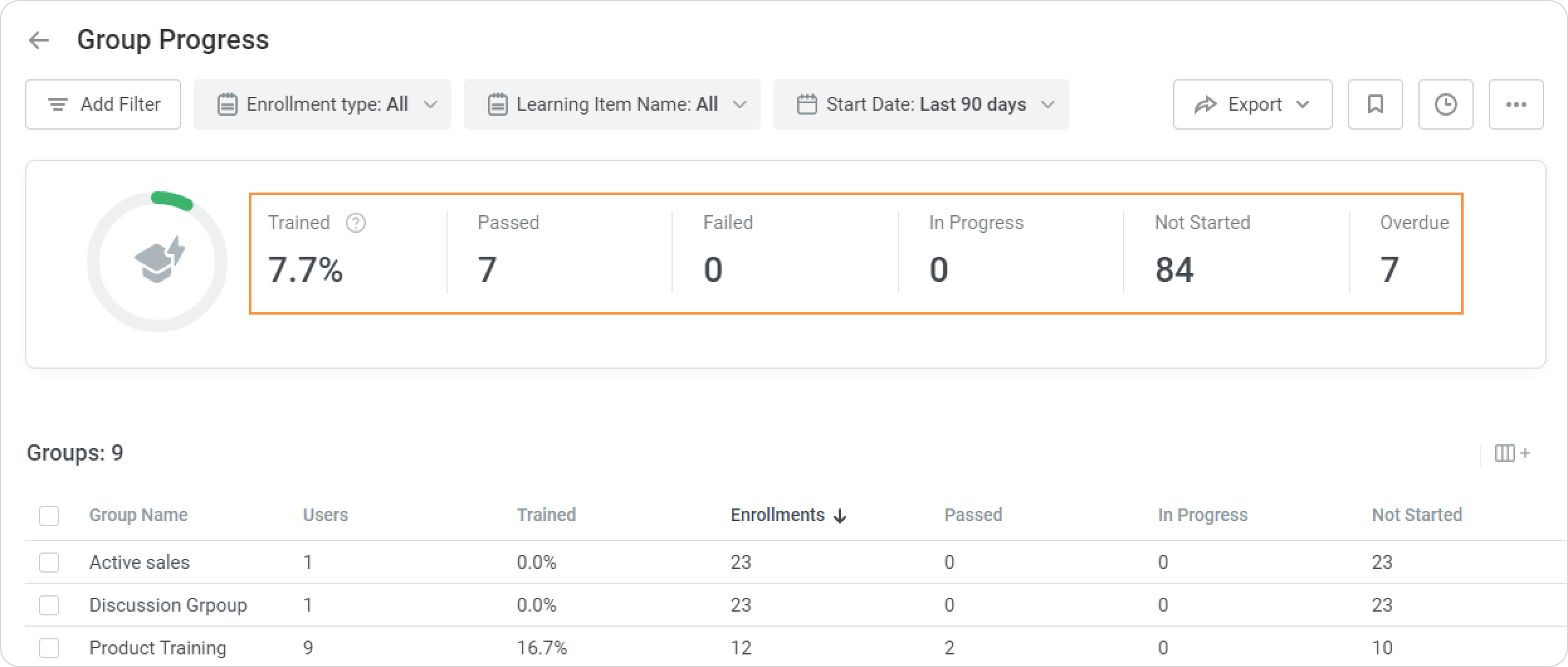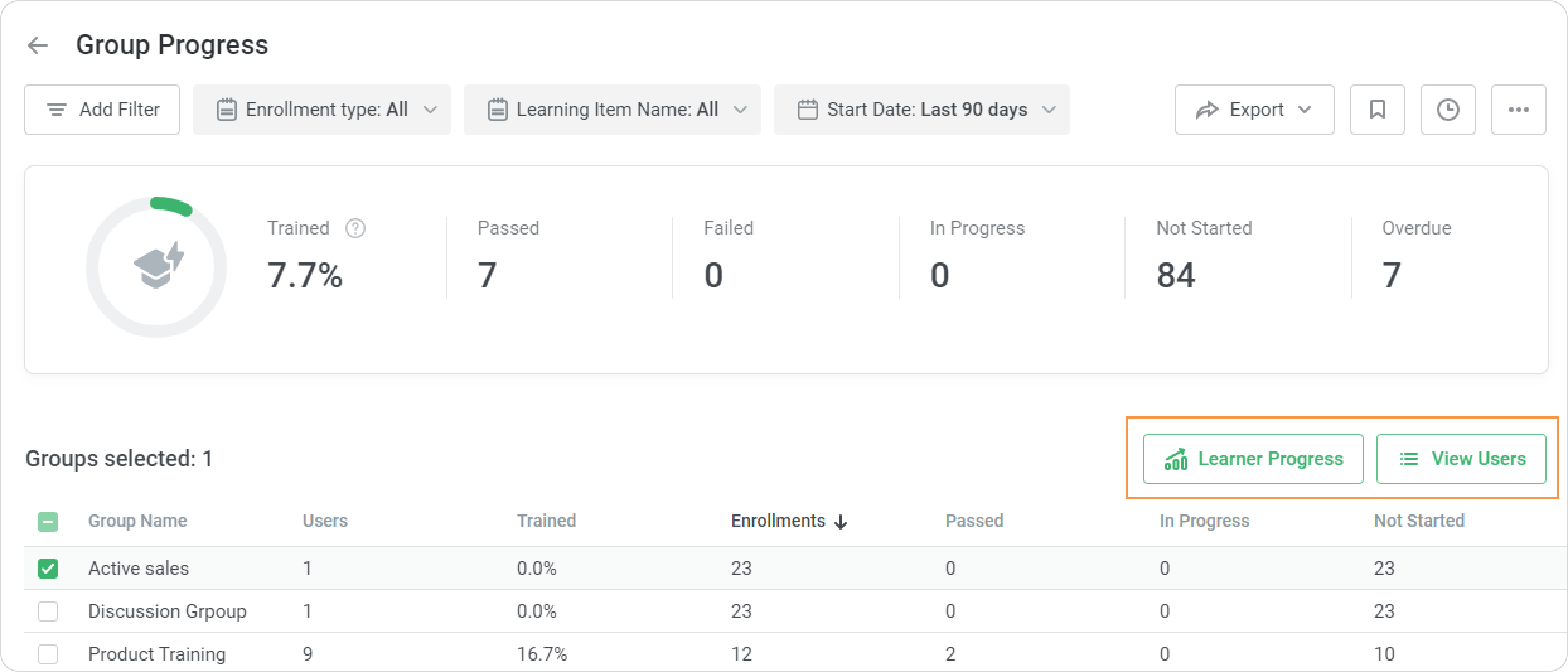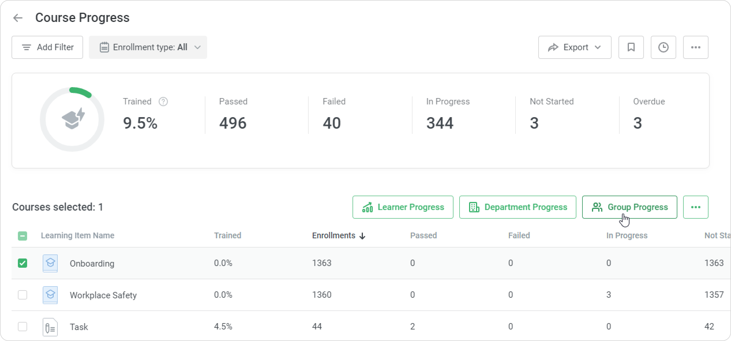 The Group Progress report is a convenient option to check group progress on one or multiple courses.