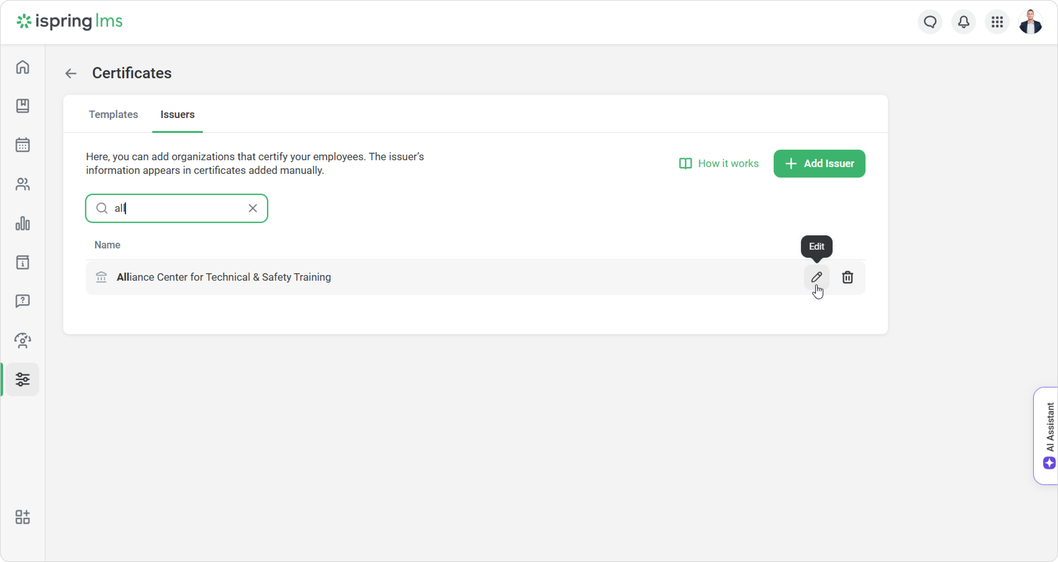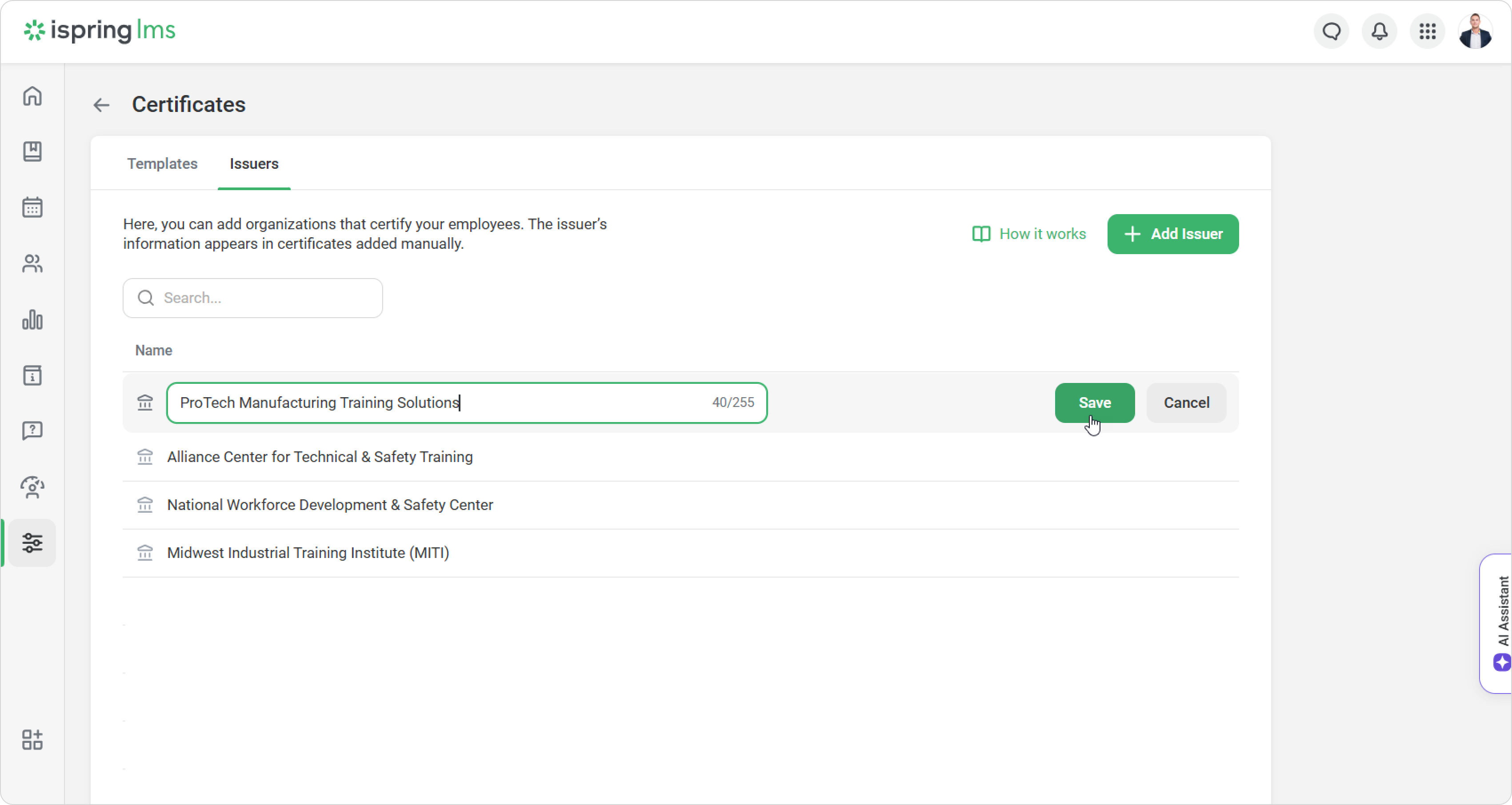 To update an Issuer’s name, click on Edit next to the current name. The new name will also appear on all certificates already issued.