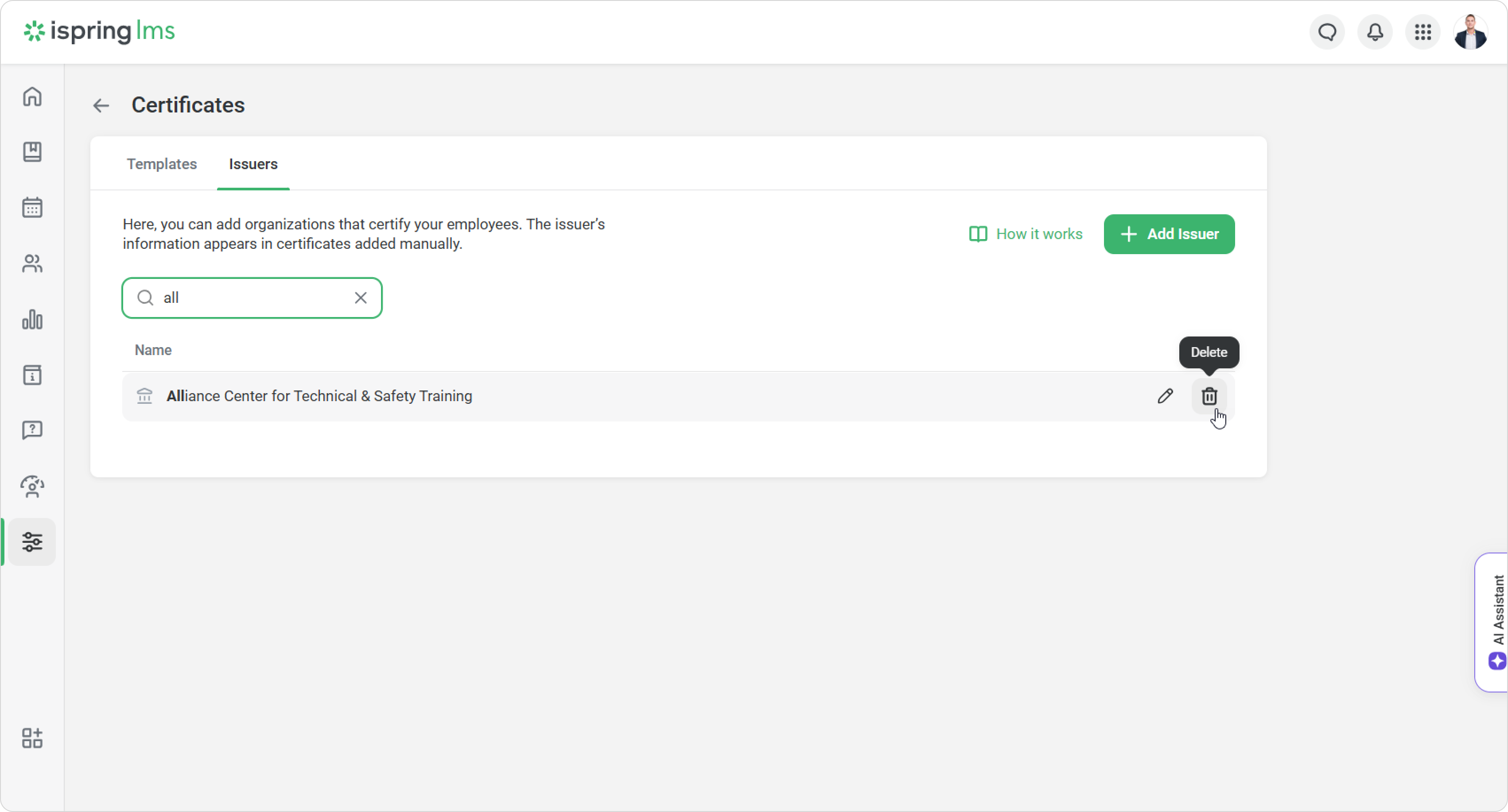 Select the Issuer you want to delete.
