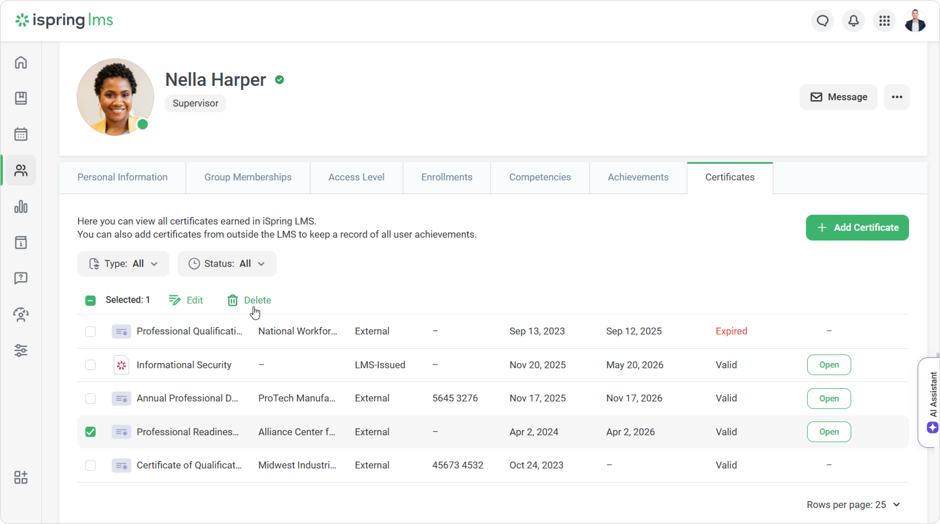 Click Edit User to open the employee’s profile and delete the certificate there.