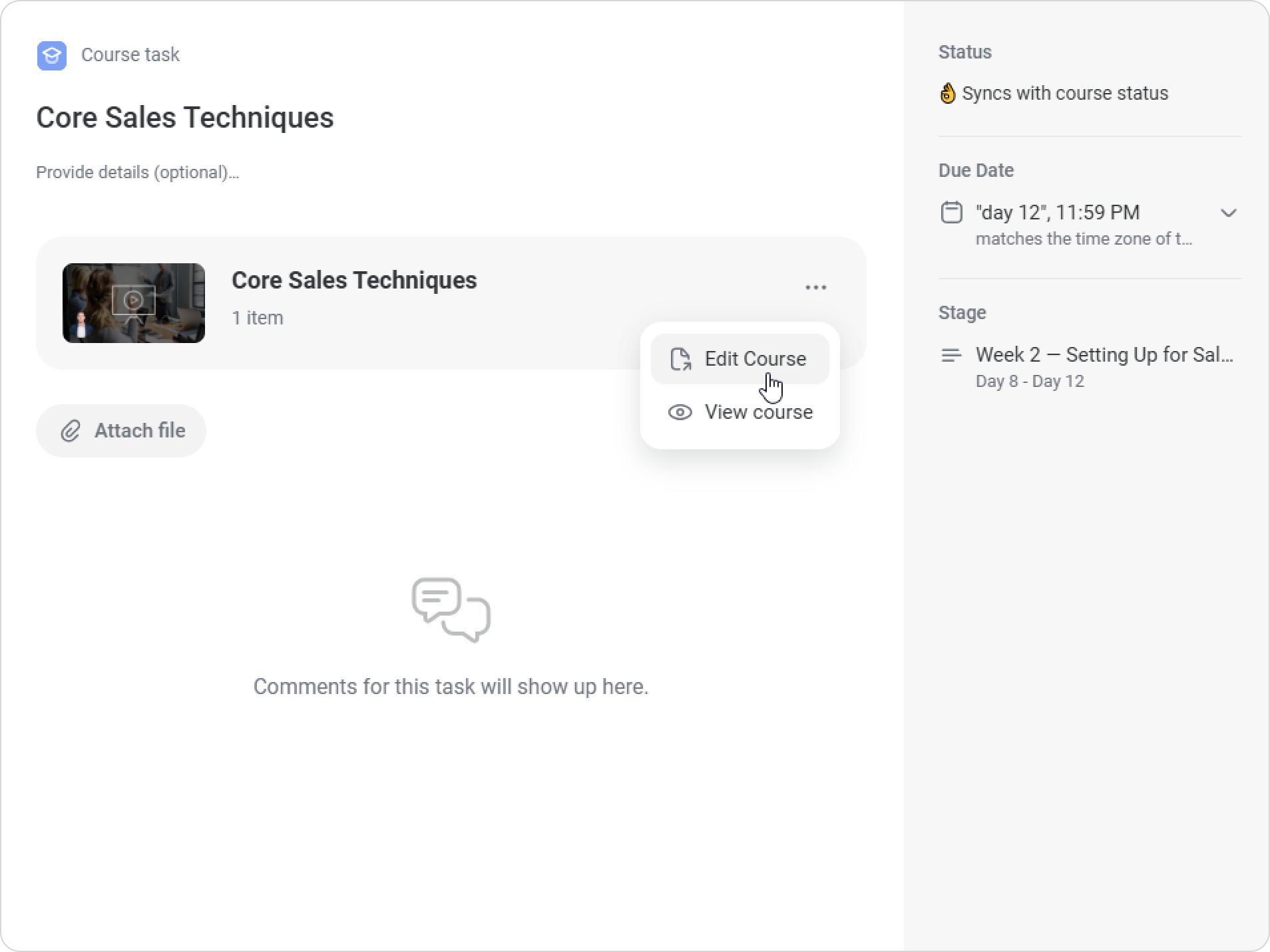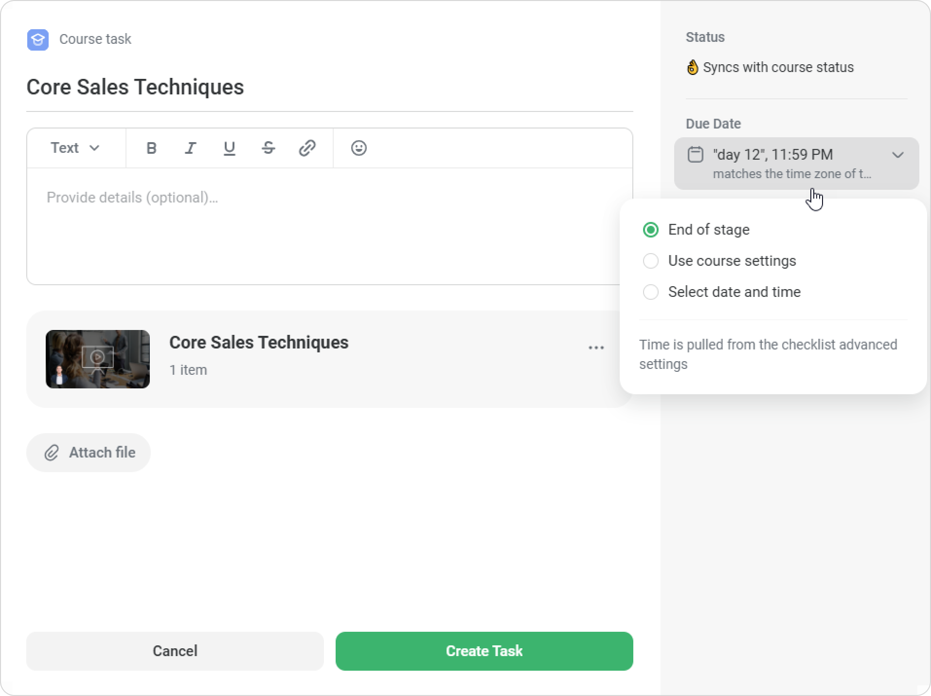The task name will be the same as the course title. You can edit it and add instructions for the employee below. - You can set a due date for the task. By default, the task is due by the end of the stage it belongs to.