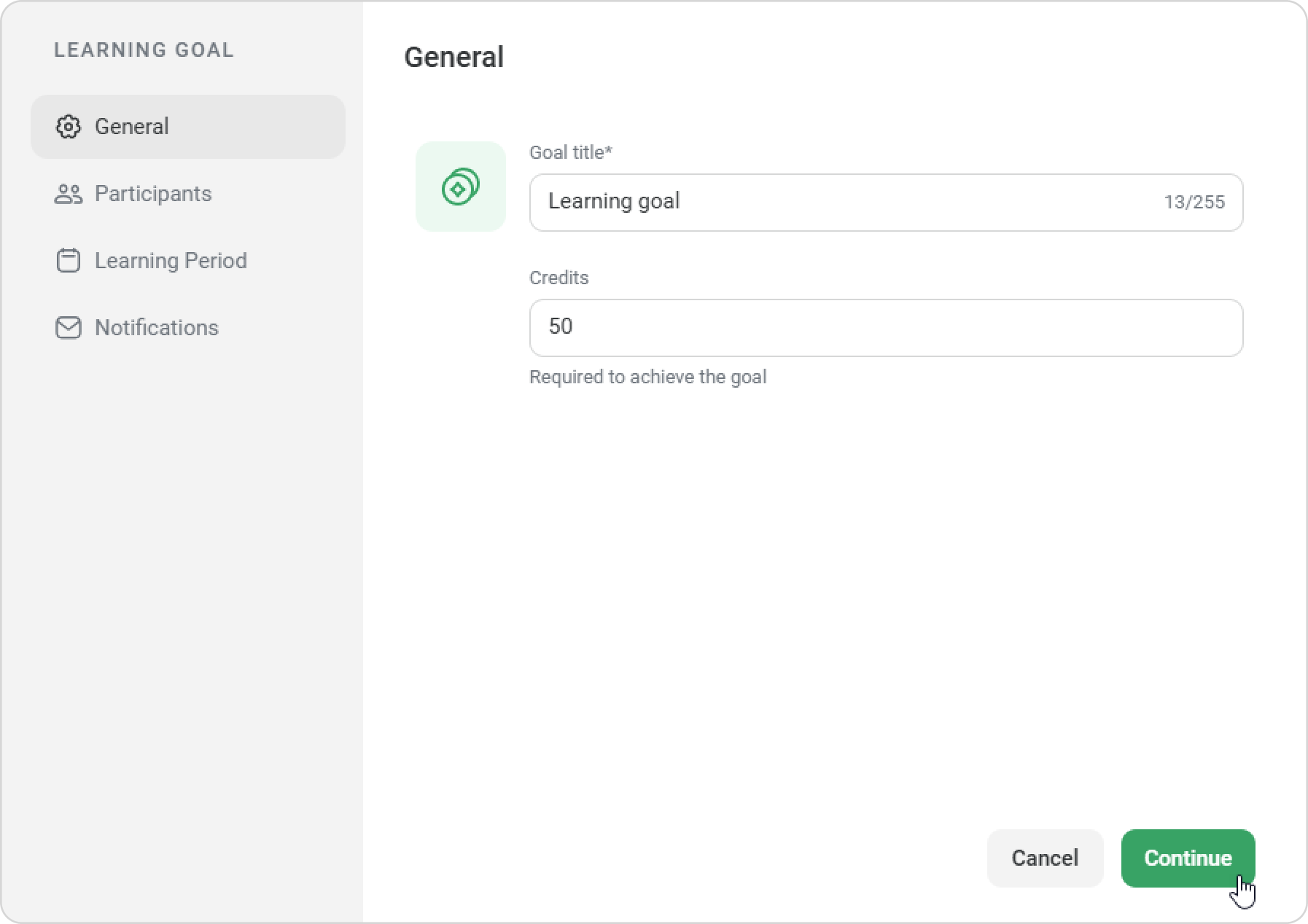 On the General page, enter the goal title and the number of credits required to achieve the goal. Then, click on Continue.