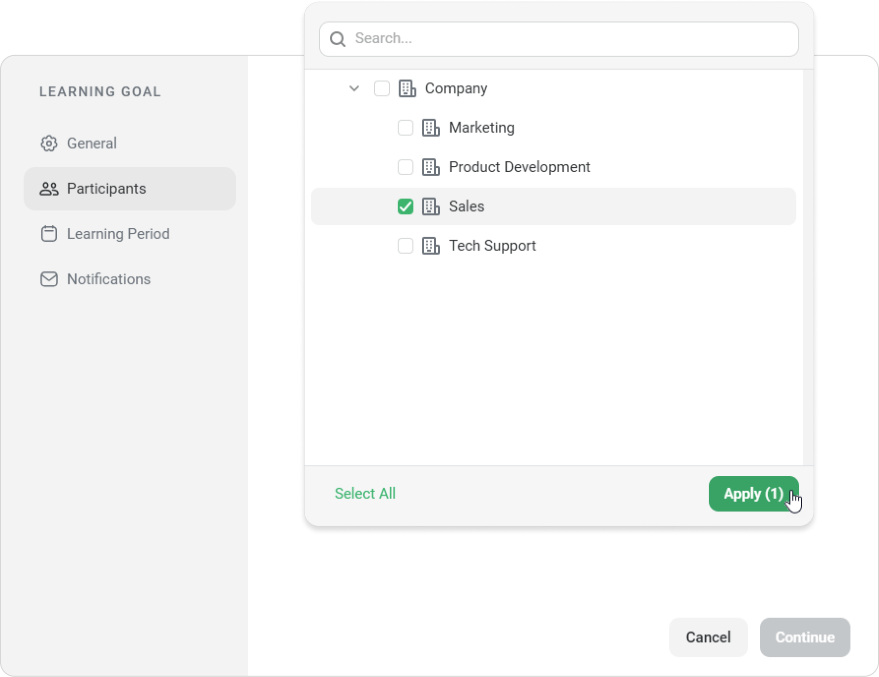For example, select the Sales department, then click on Apply > Continue.