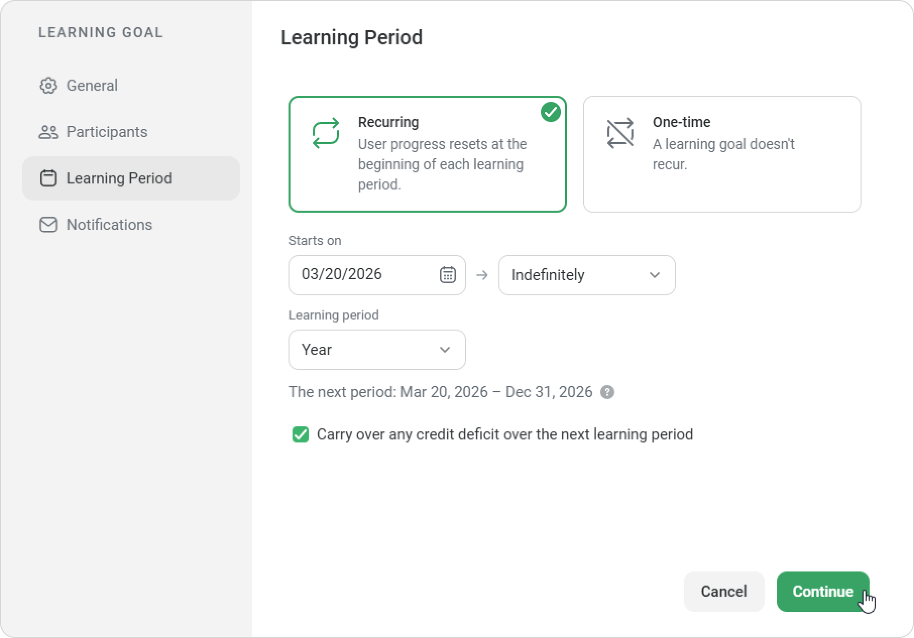 On the Learning Period page, choose whether the goal is recurring or one-time: