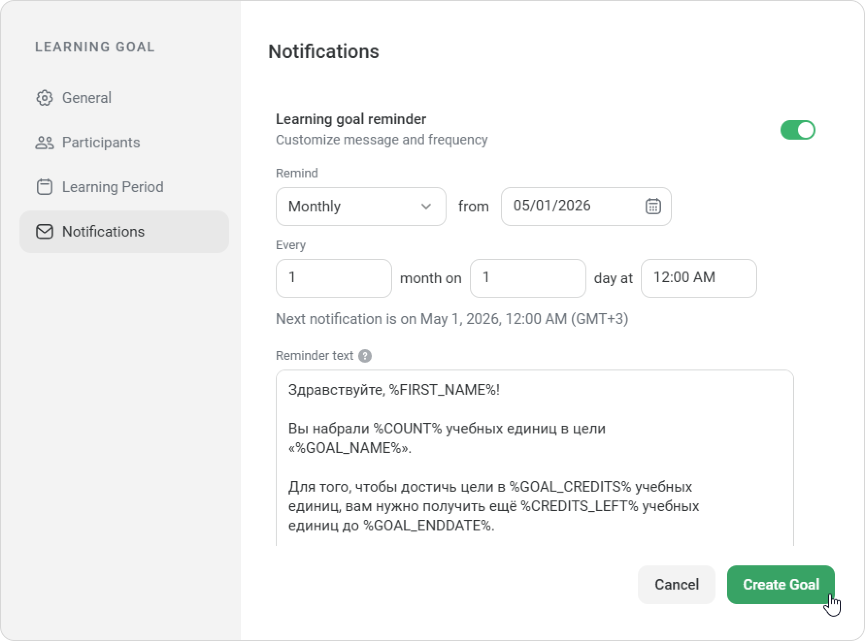 You can customize the message and frequency for the Learning goalreminder notification. Finally, click on Create Goal.