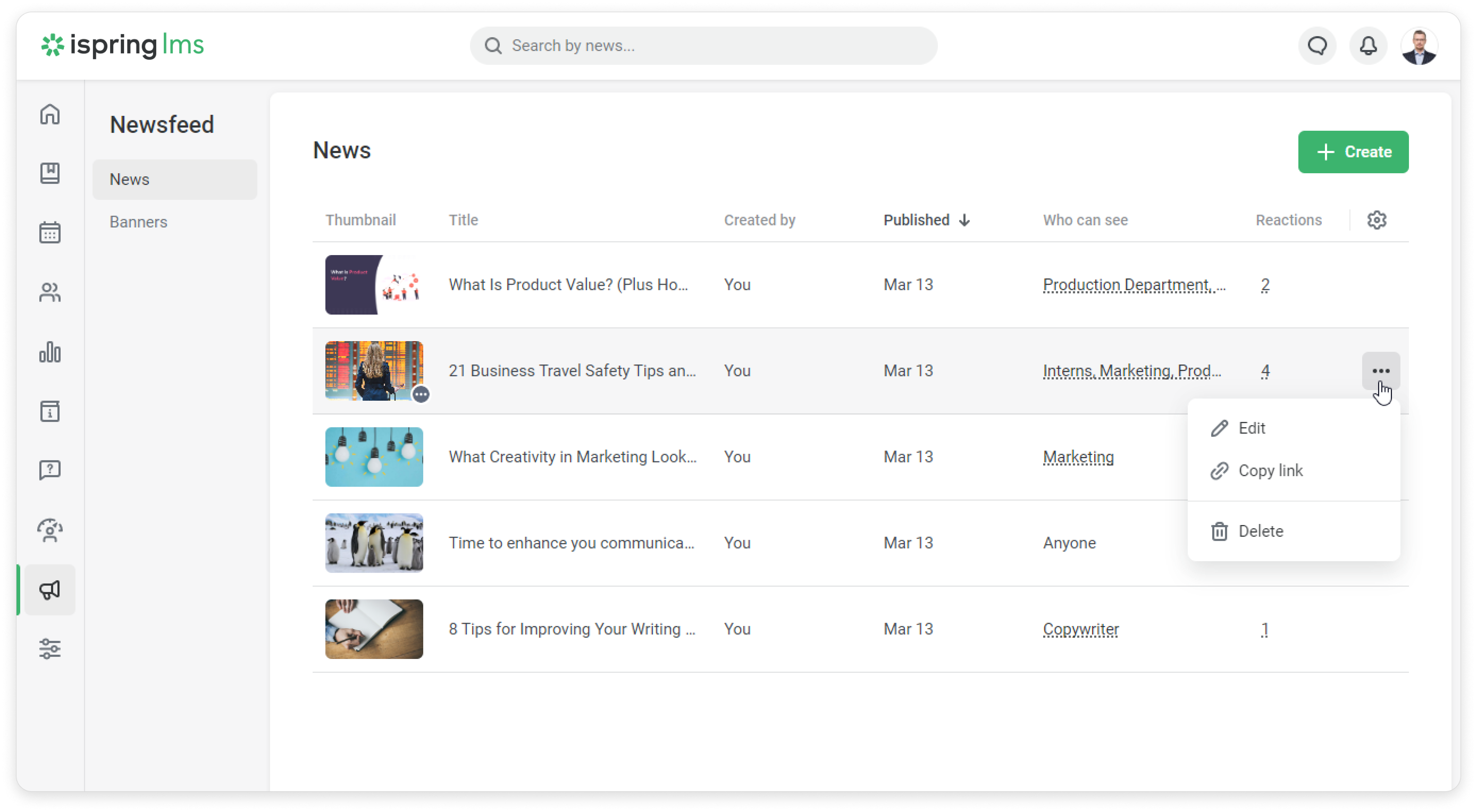 Then, enable reactions, so readers can react to the news. To enable learners to receive email and push notifications about news, enable notifications.