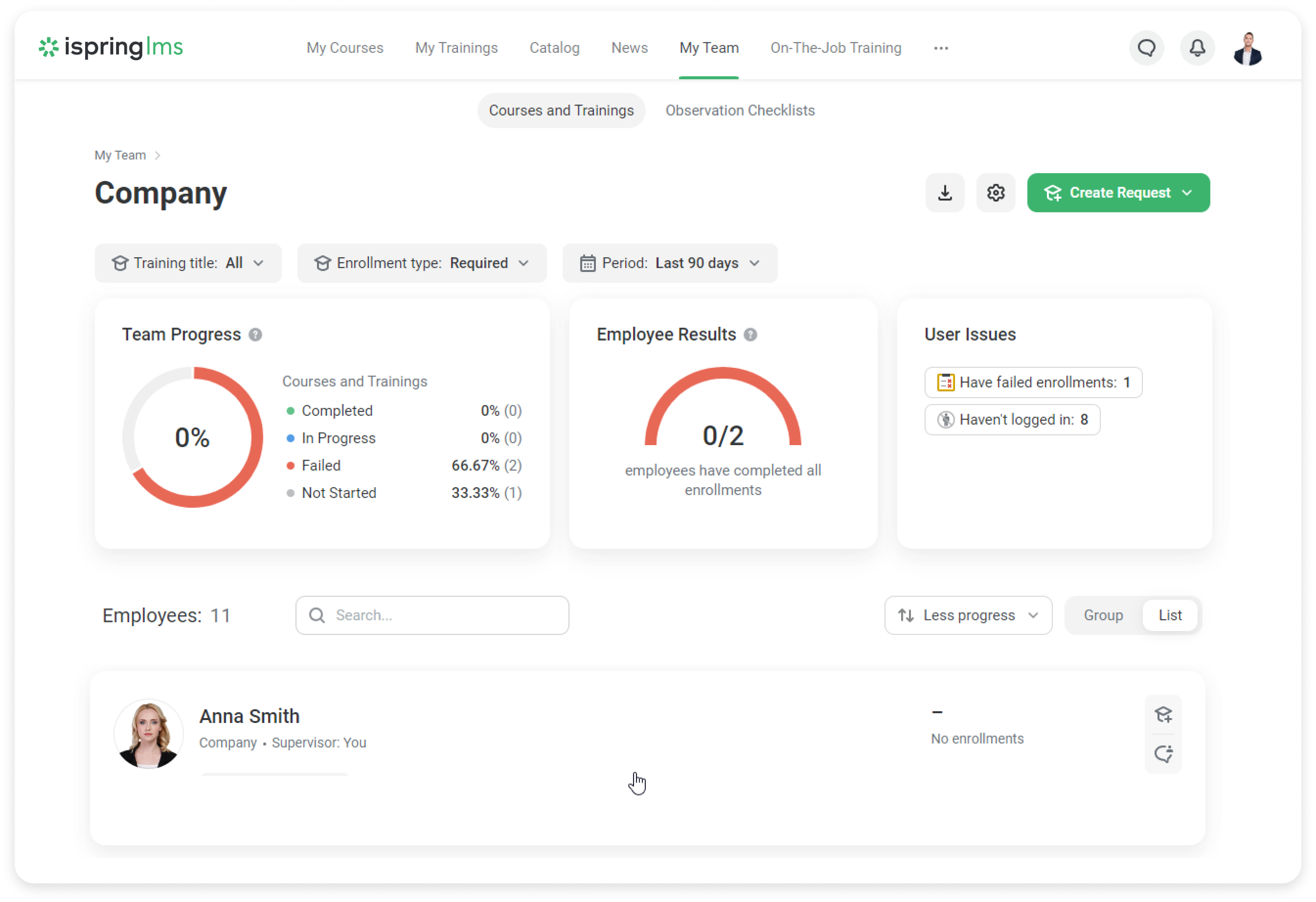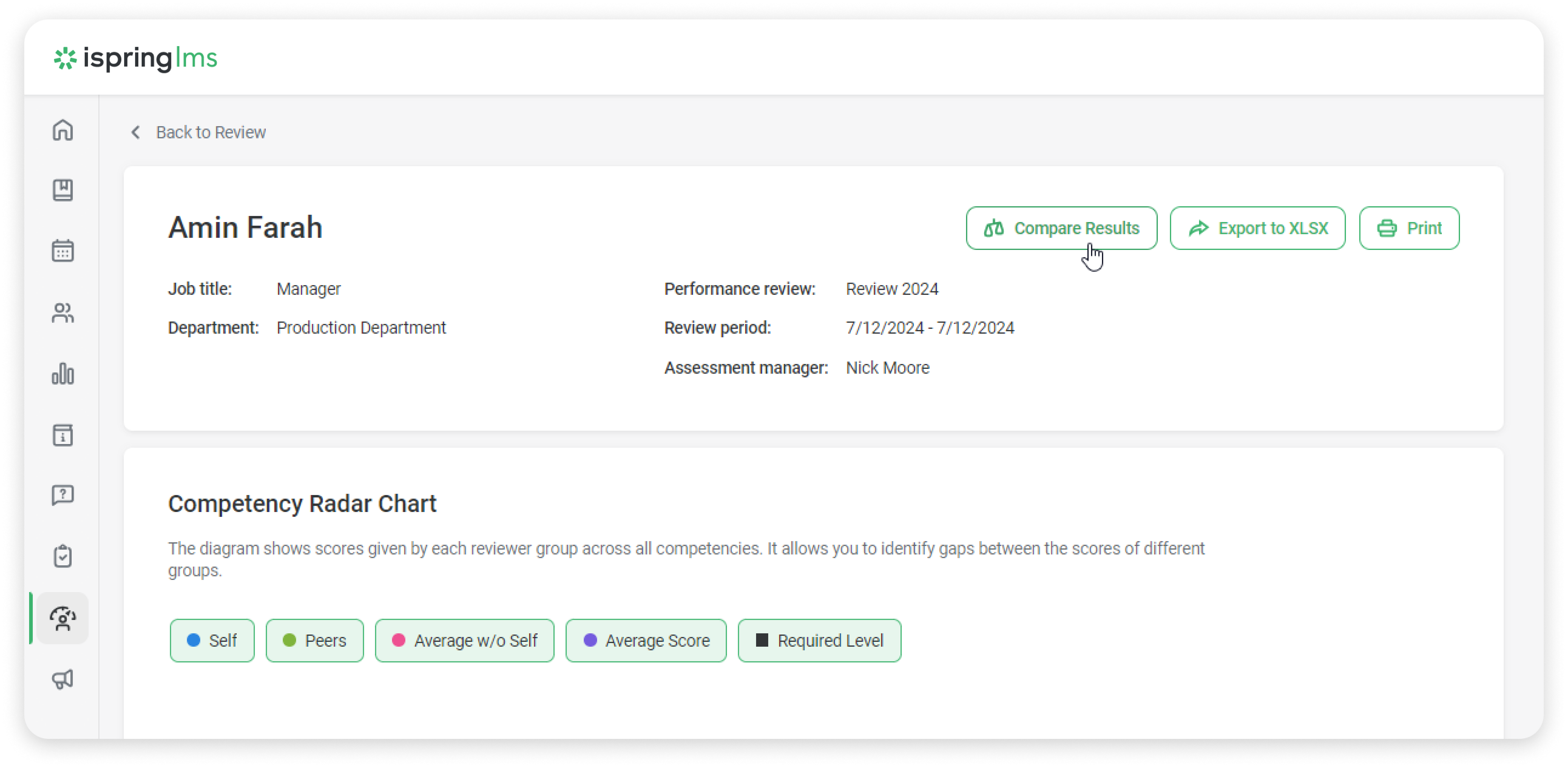 iSpring LMS offers a report for comparing employee results across 360° performance reviews. This streamlined report lets you see the impact of training on key competencies.