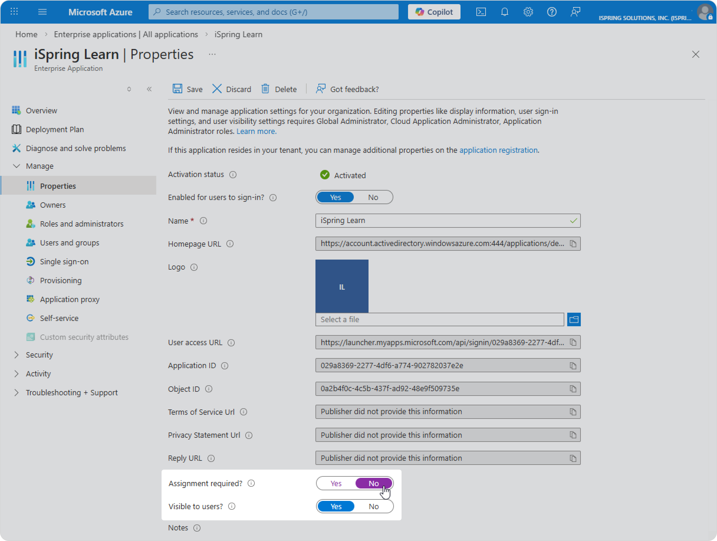 If you disable it, you don’t need to assign users to the application manually. Users can sign in to iSpring LMS via SSO, and the system will automatically create their profiles on first login.