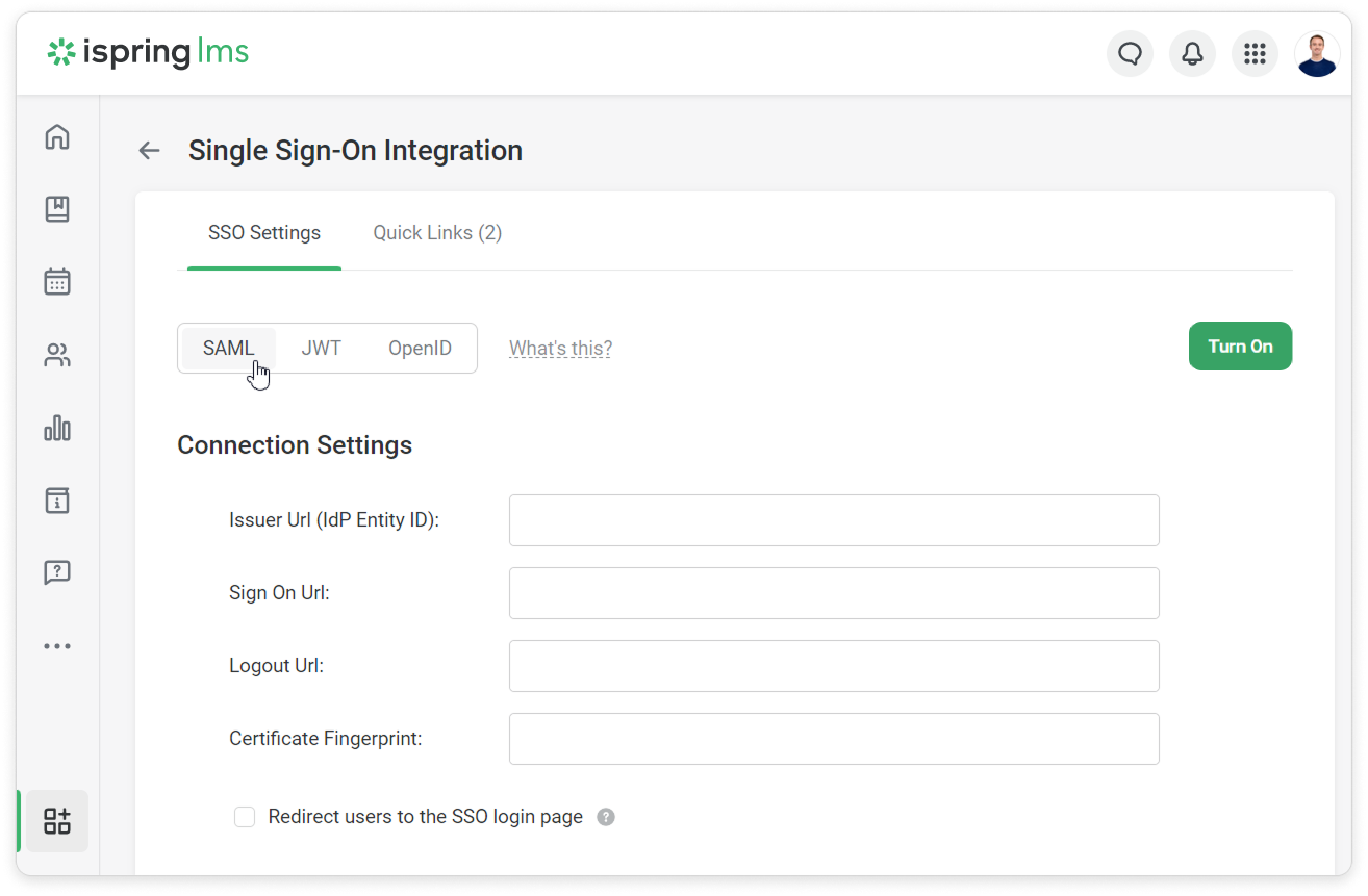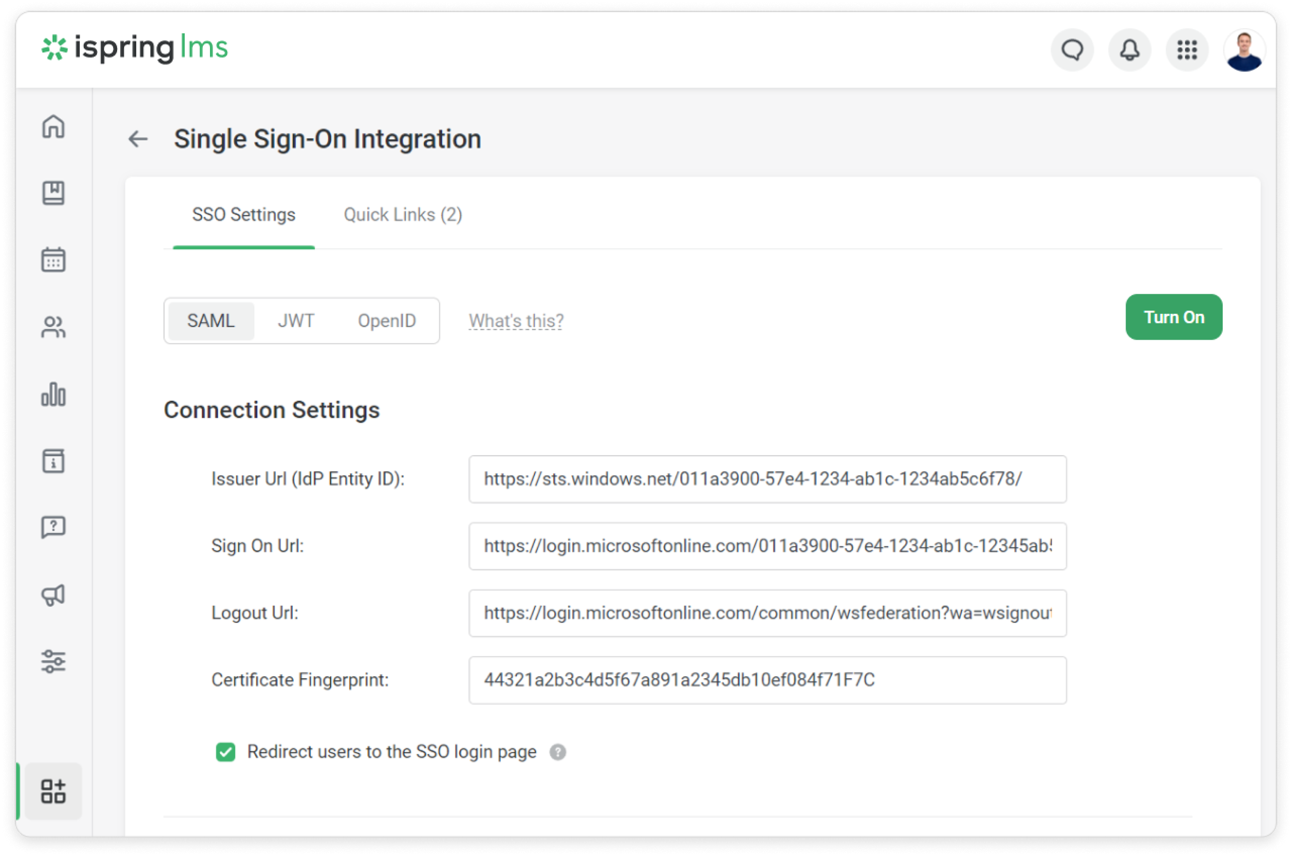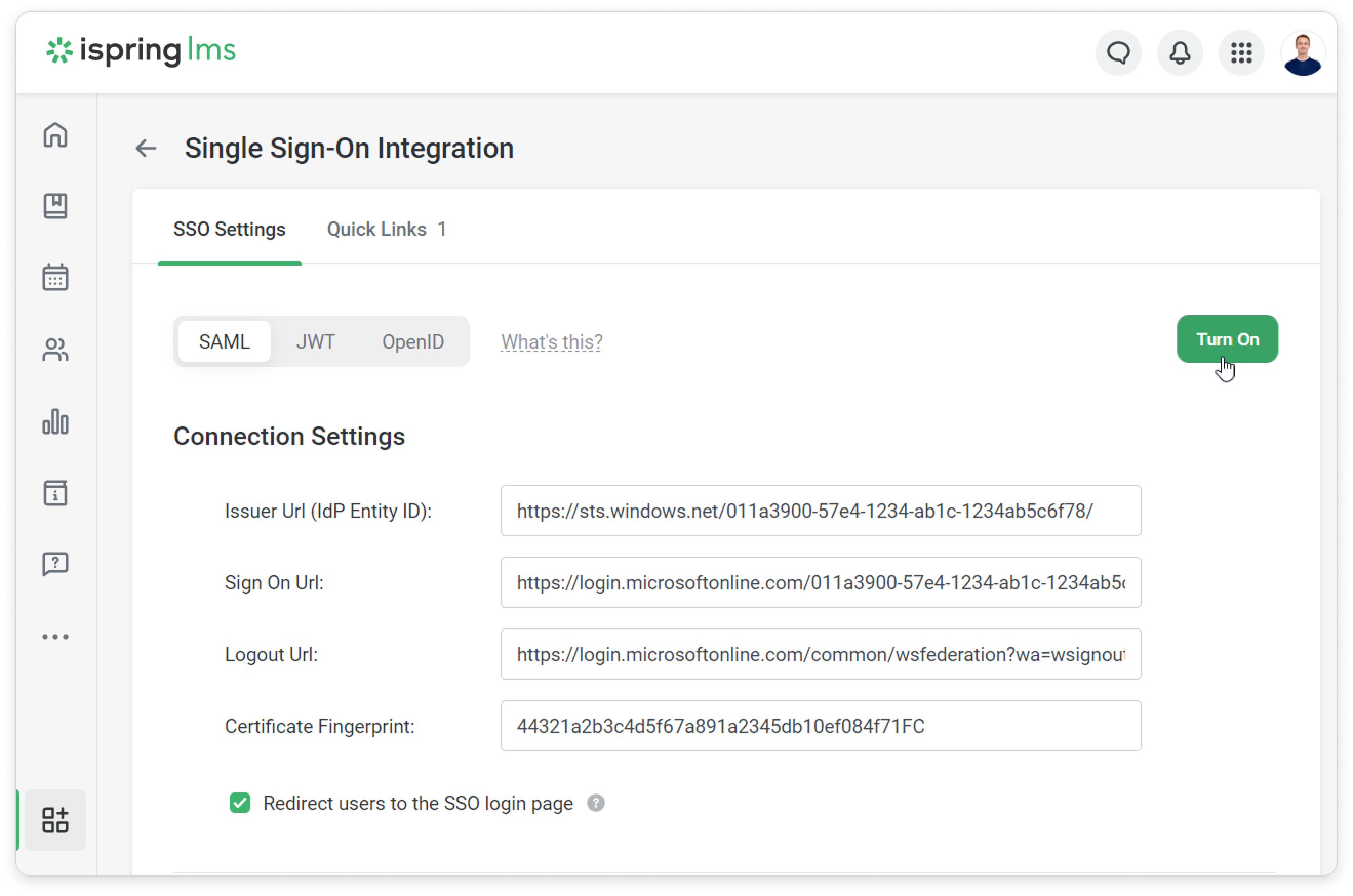Redirect users to the SSO login page If this option is enabled, the iSpring login page will have the following URL: https://yourcompany.ispring.com/sso/login. +