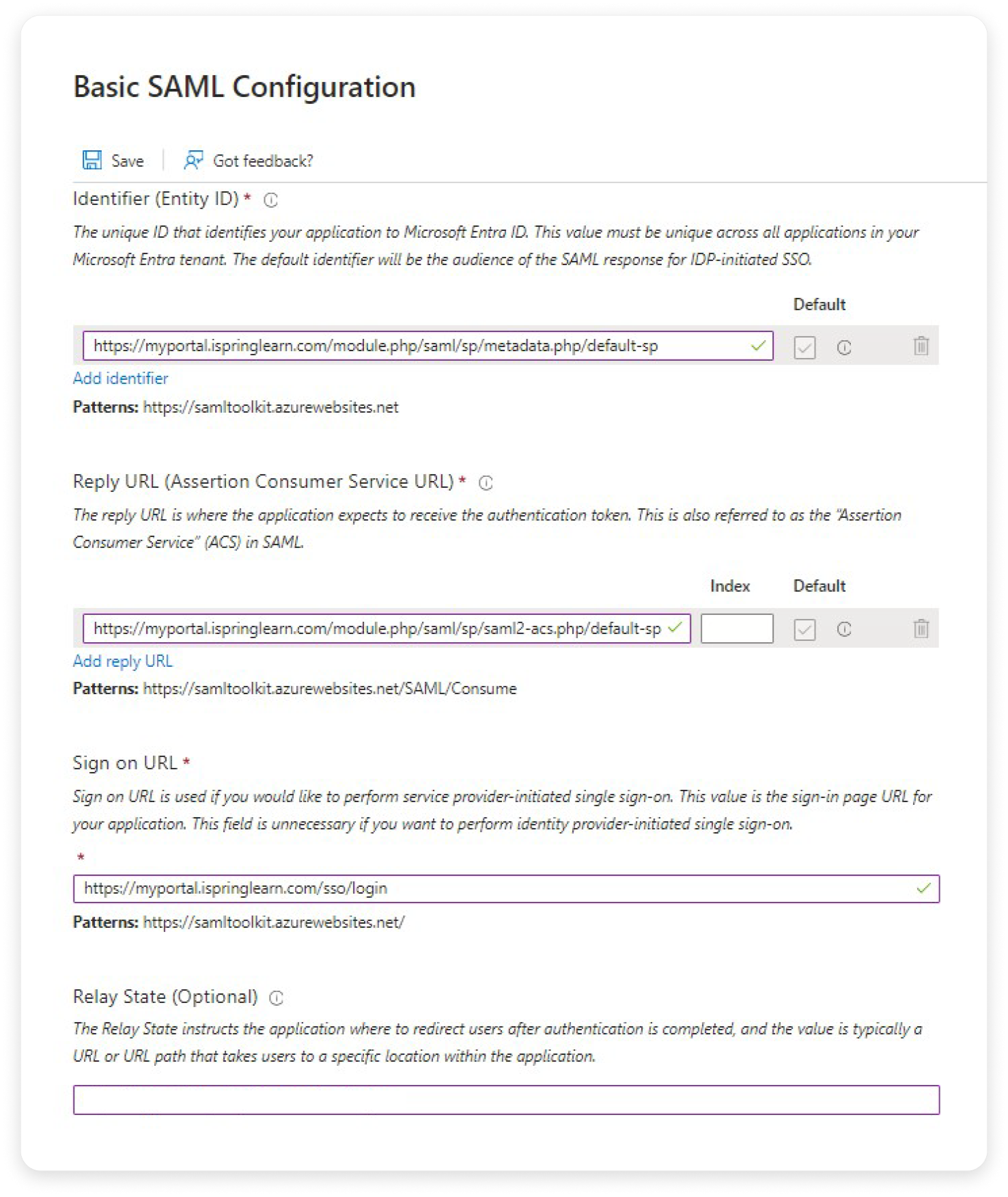- Then, go to Set up iSpring LMS SSO. The values of the Login URL and Microsoft Entra ID fields will be required later when setting up SSO on the iSpring LMS side.
