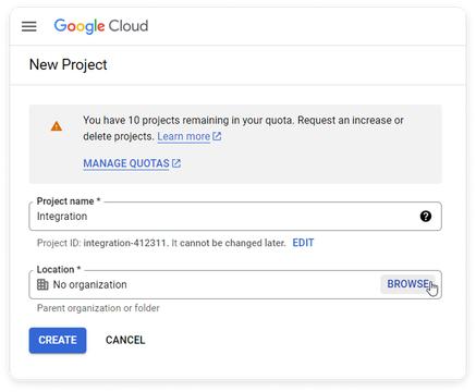 - Log in to the Google Cloud console. Click on the menu icon > IAM & Admin > Create a Project.