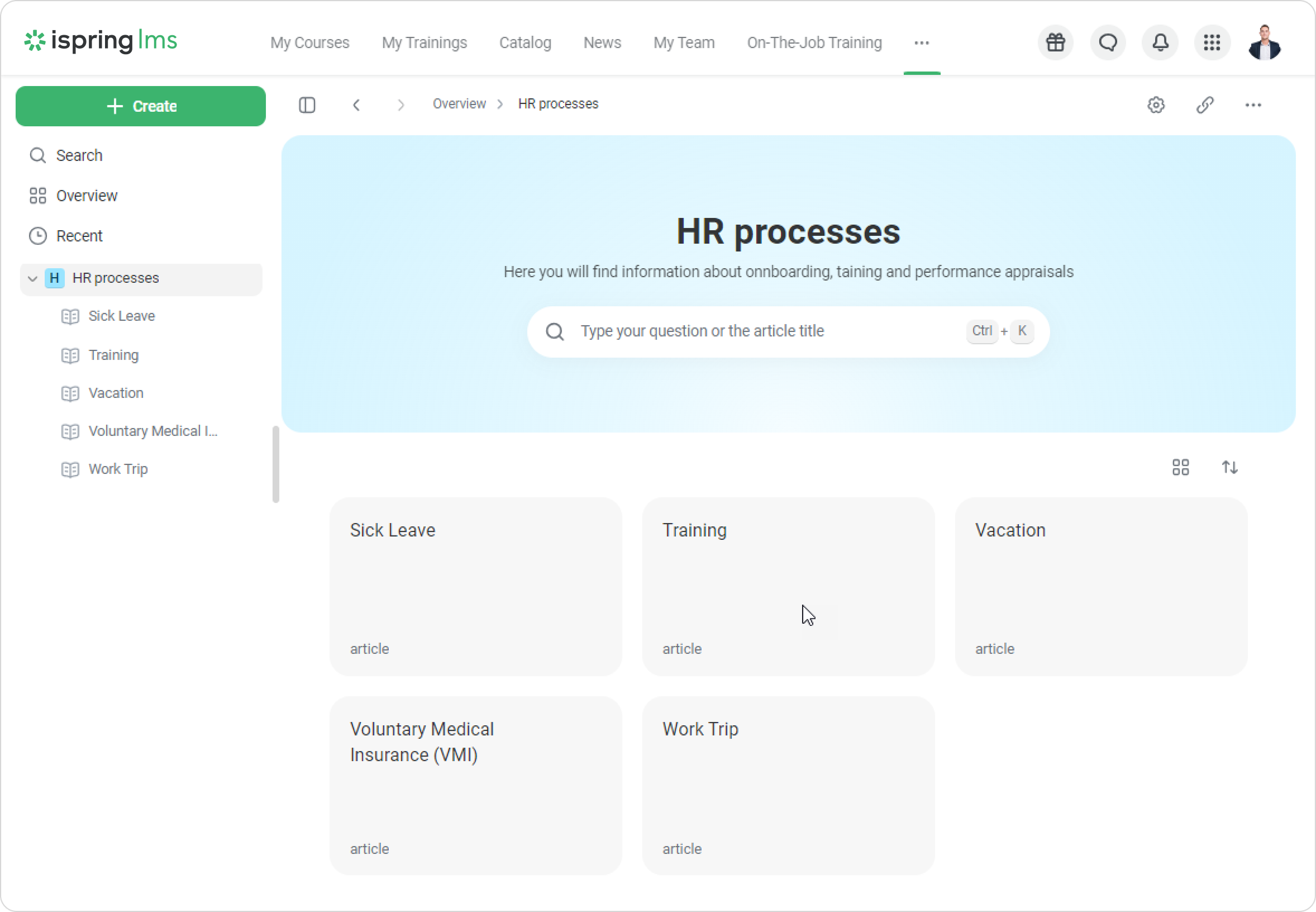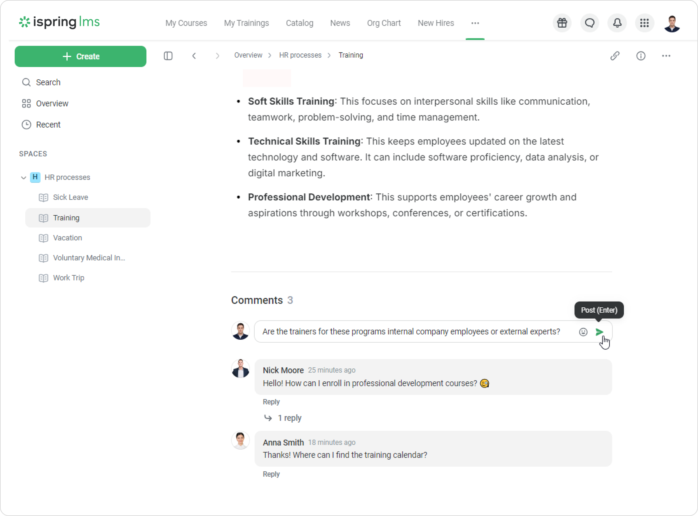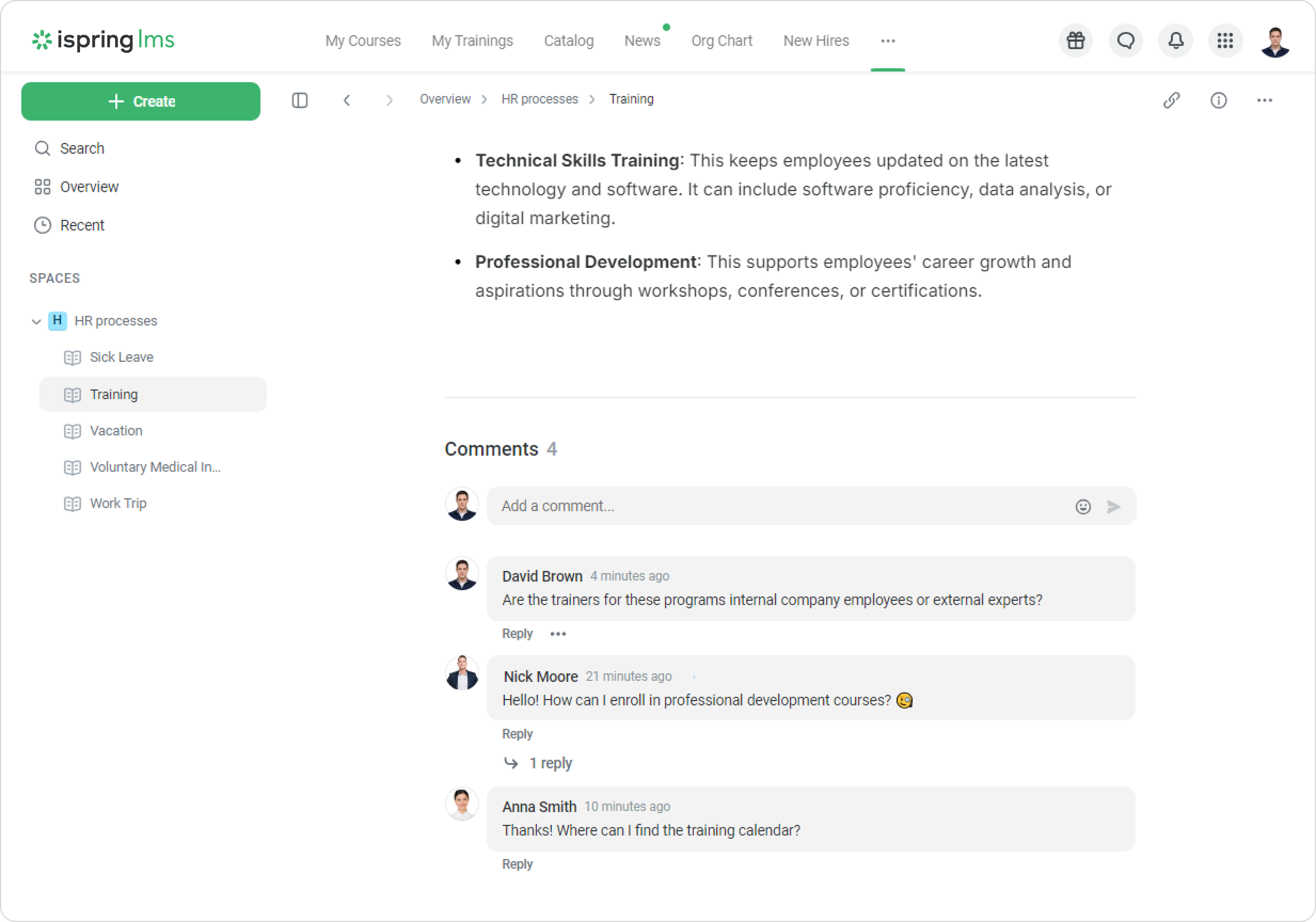 iSpring LMS allows employees to leave feedback, share insights, and ask questions directly on articles in the Knowledge Base. Engage with colleagues and authors in dynamic discussions.