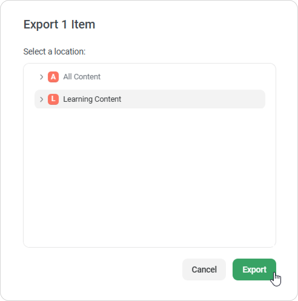Then choose the space to copy the content to, and click on Export.