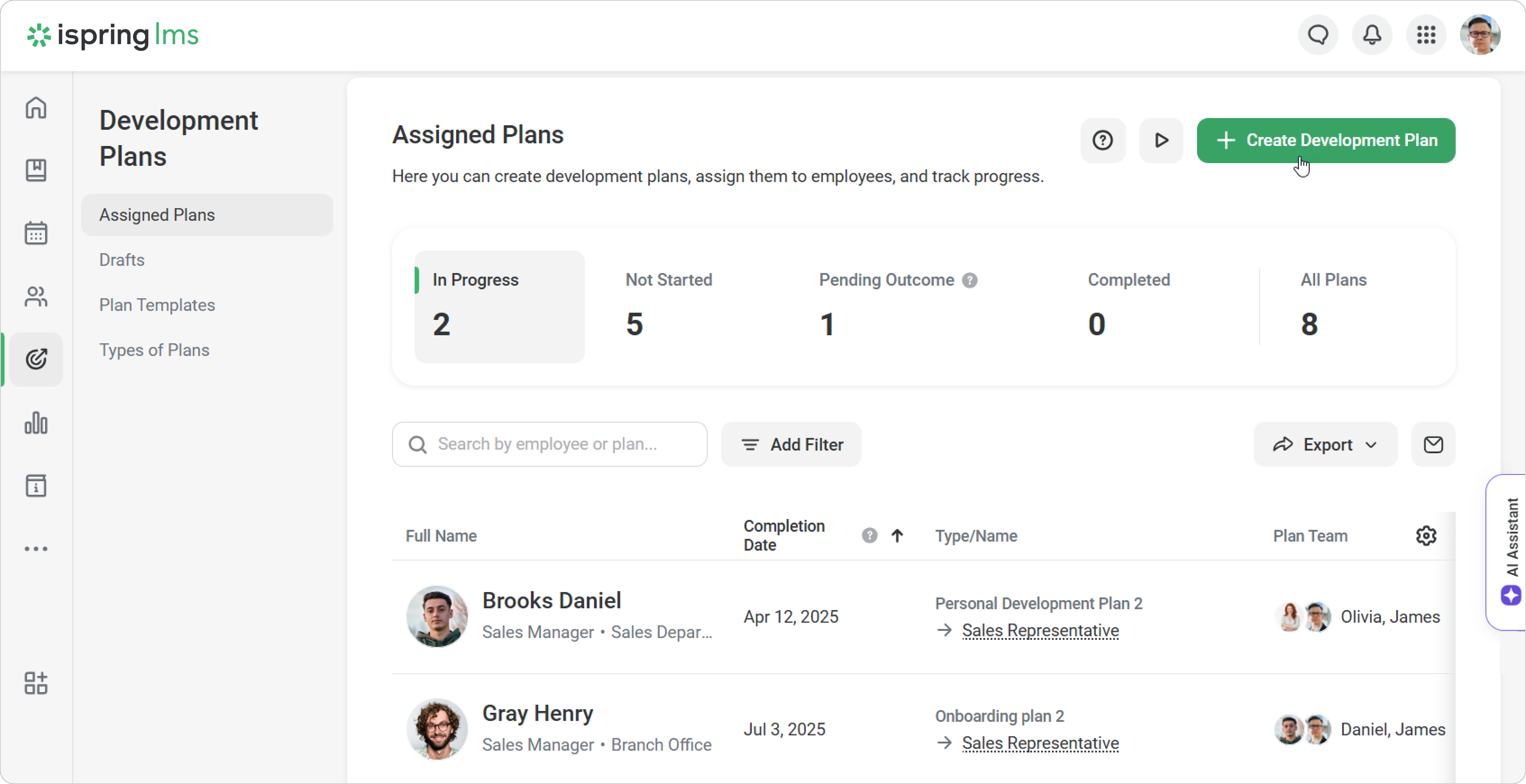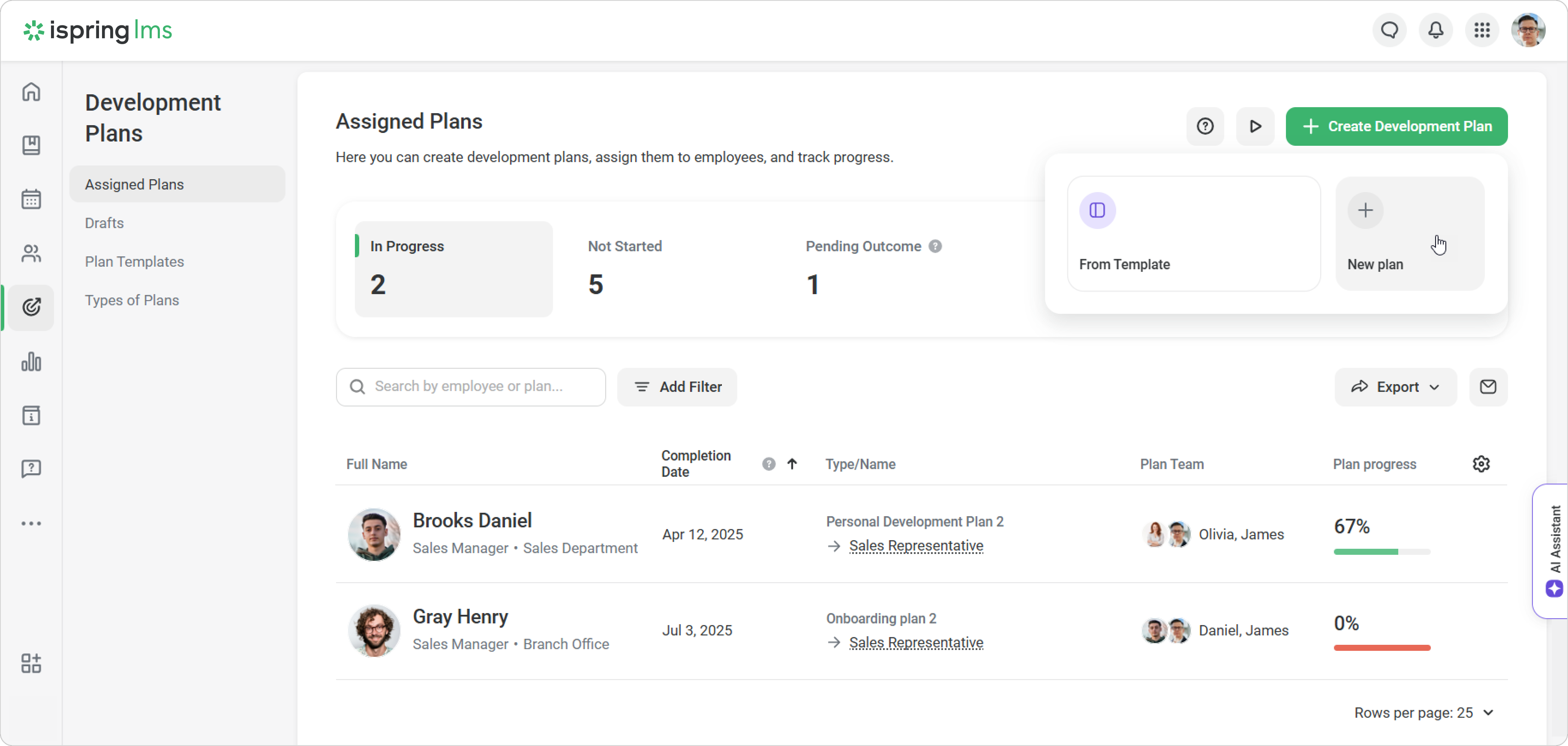 iSpring LMS Development Plans How to Create a Development Plan Current: How to Fill In the General Information How to Fill In the General Information Select Development Plans > Assigned Plans > Create Development Plan.Alternatively, you can go to Development Plans > Plan Templates > Create Template.Click on New Plan.Insert a name for the plan on the General tab.Next, select a plan type. The default plan types include onboarding and personal development plans. Then, select a start date. Typically, this is the employee's first day at work. By default, the plan starts on the following Monday at 12:00 PM. Be sure to add the new employee as a user to iSpring LMS in advance, using their work email. In the Optional section, you can enable Plan Description and Goals to make them visible to the employee. Add the description as a text, a bulleted list, or a numbered list.Once you've filled in the description, click Save.Next, enter the plan's goals. If there are more than three goals, click on Add Goal. Save your changes.Next, we’ll select the employees who will receive a development plan. ×