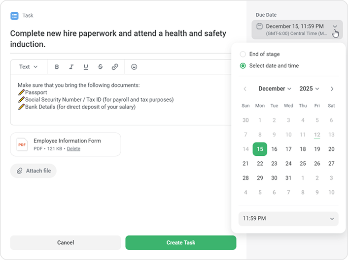 By default, tasks for the first day should be completed by the end of the day, and other tasks are due by the last day of that stage. In the Due Date field, you can set custom due dates, by midday, for example. Just choose Select date and time.