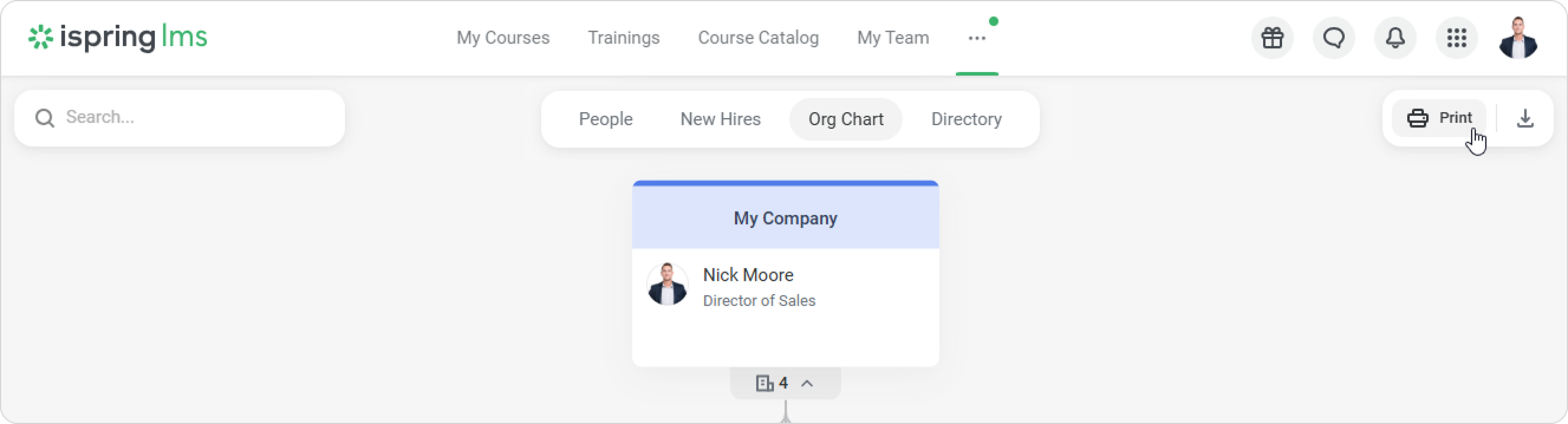 iSpring LMS Settings Additional Options Company People Organizational Chart Current: How to Print an Org Chart How to Print an Org Chart Click Print.Then, configure the chart display in your browser settings and click Print again.You can also download the diagram in PNG format. To do this, click on the download icon. ×