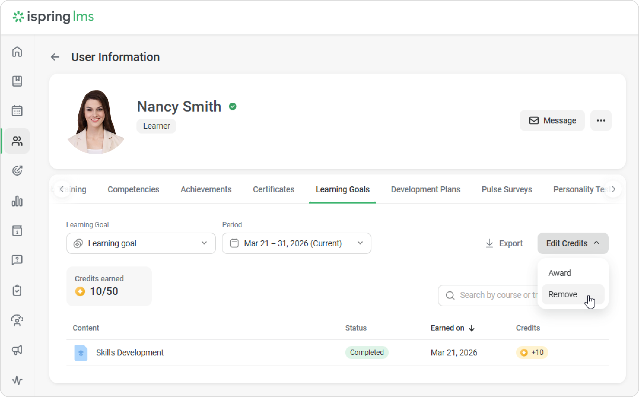 Administrators and users with a custom role can manually award or revoke learning credits in the Administrator Portal.