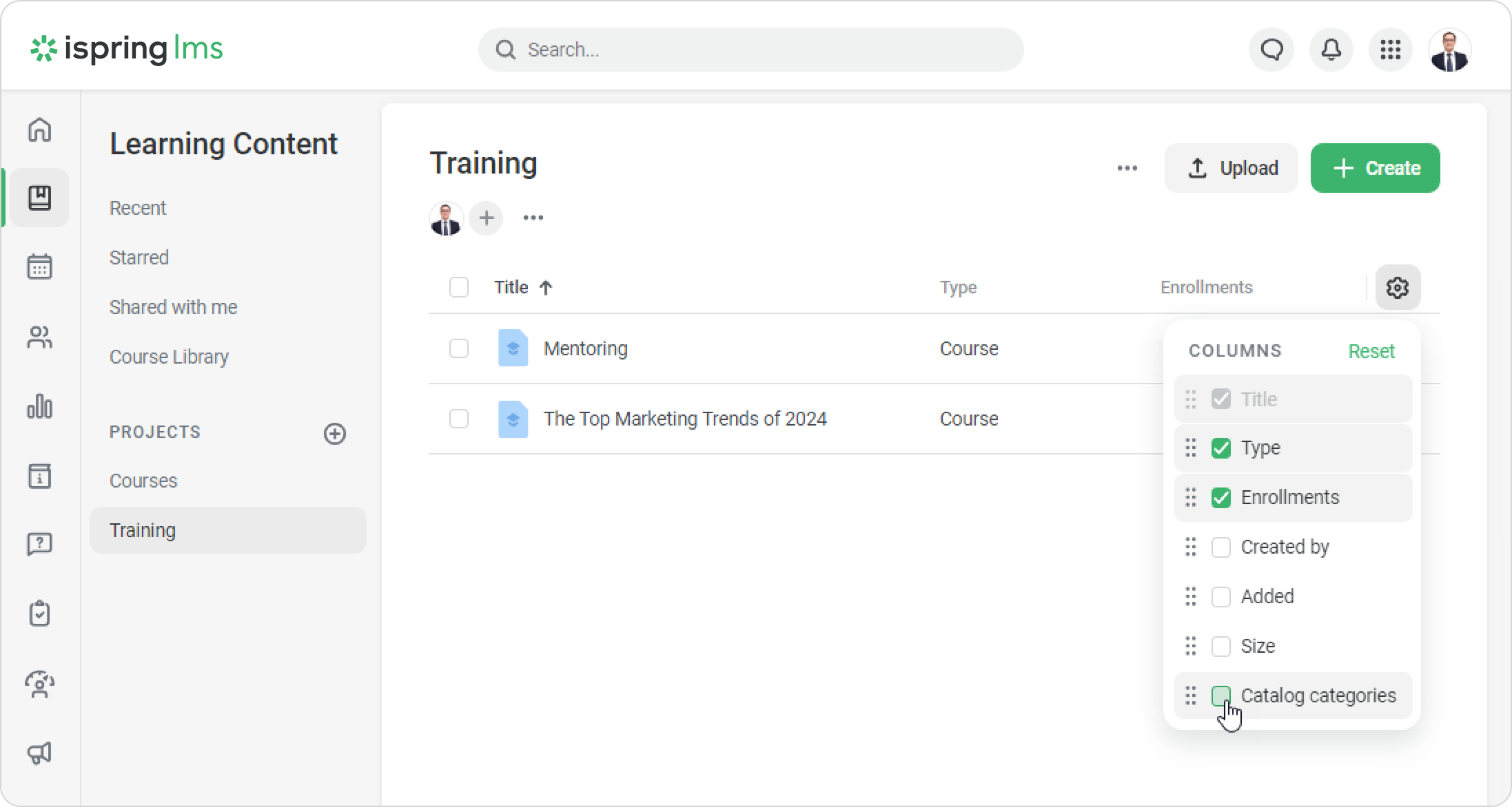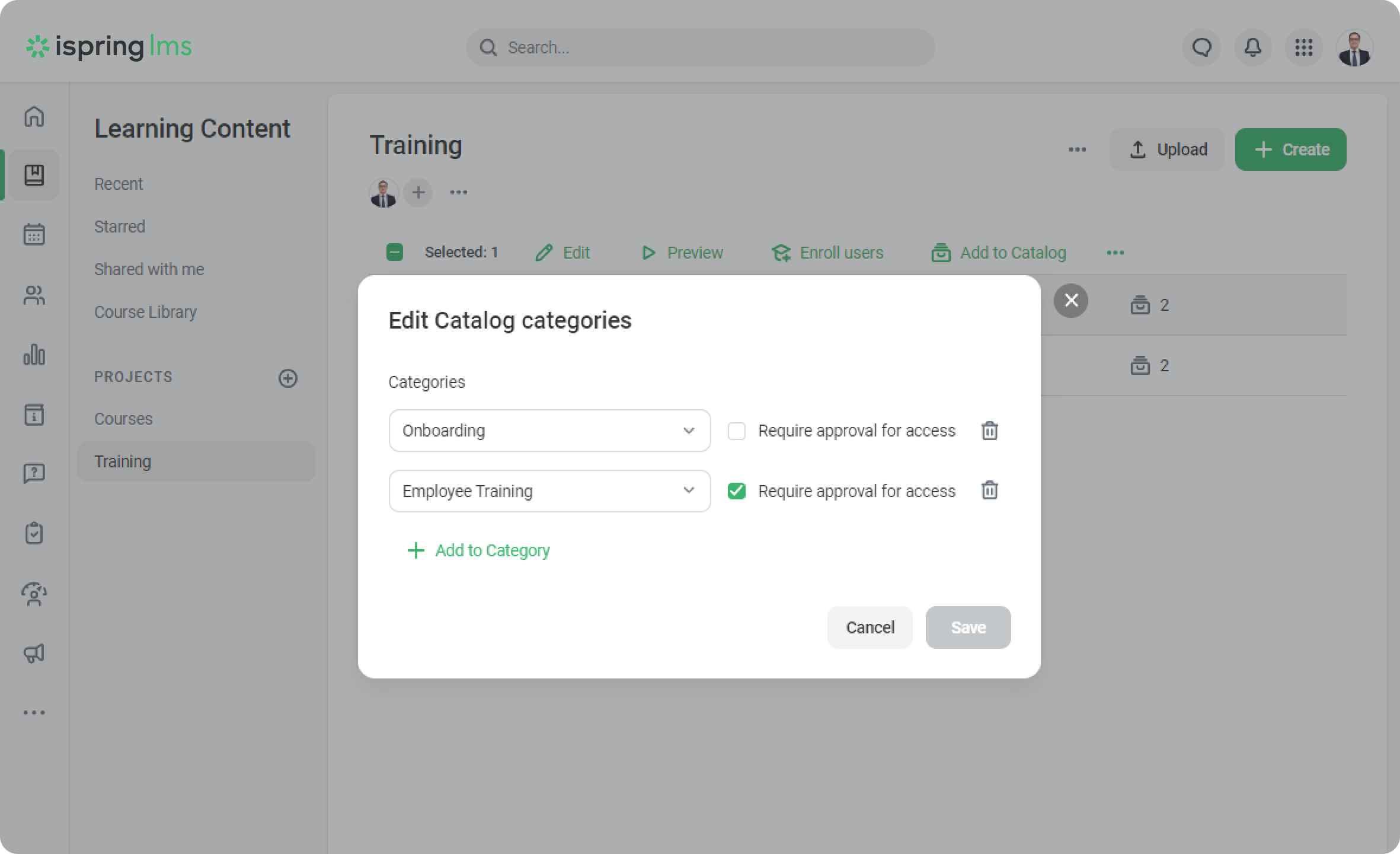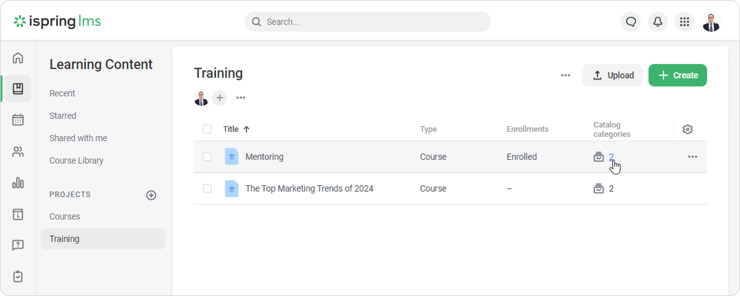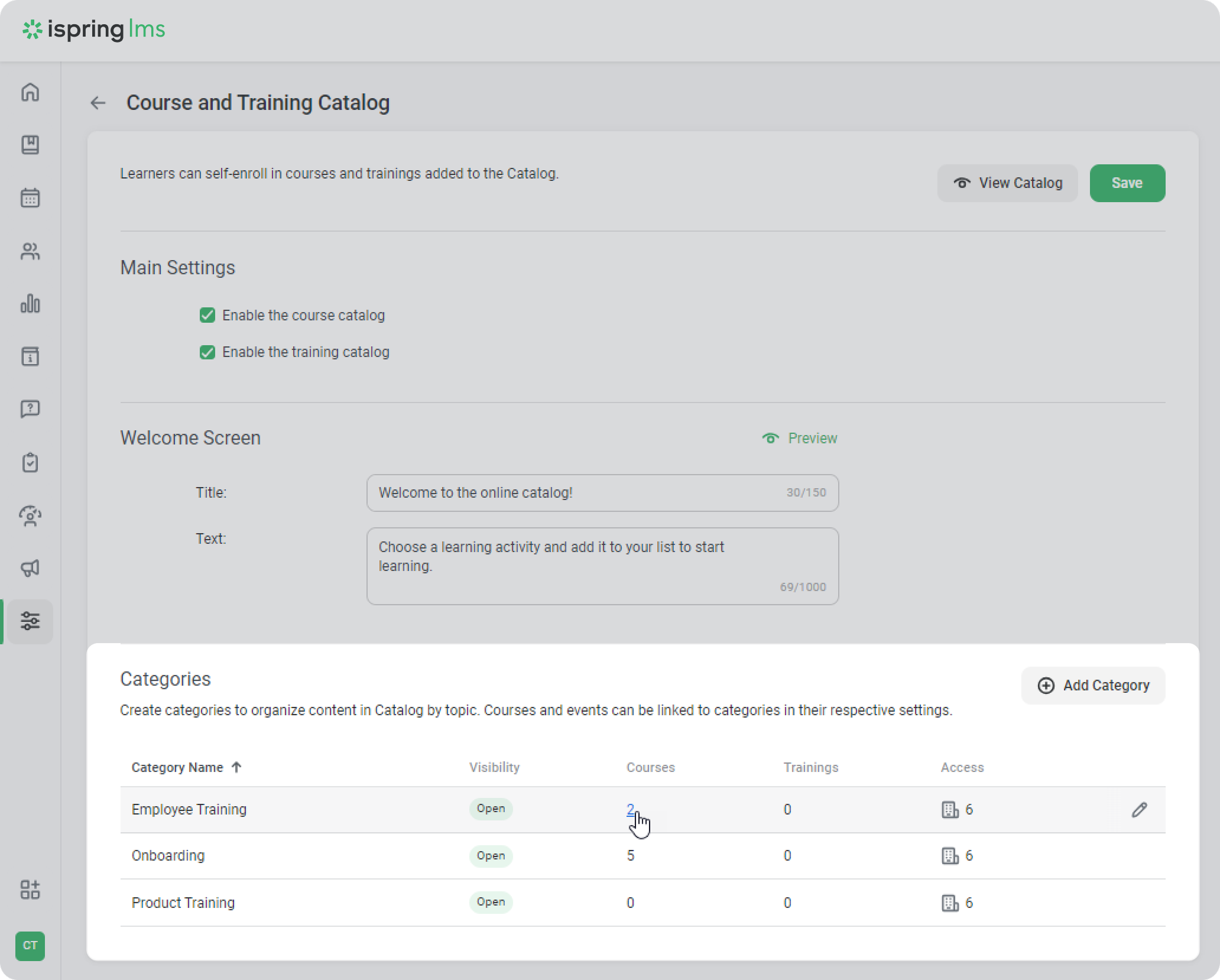 iSpring LMS Settings Additional Options Catalog Adding Courses and Trainings to Catalog Current: How to See What Categories a Course Is in How to See What Categories a Course Is in You can find course placement in different categories in several ways:When editing a categoryIn the Course categories columnIn the catalog settingsIn the “Course categories” columnOpen the list of courses in the Learning Content section.Click the gear and select the Catalog categories column.In the Catalog categories column that appears, you will see the number of categories that the course is in.Click on the number next to the icon, and you’ll see the categories where the course is located.Done! Now, the training manager can easily go to the category of the course and edit it.In the Catalog settingsGo to Settings > Course and Training Catalog > Categories, and click on the number of courses.There you’ll be able to see which courses are stored in the catalog. ×