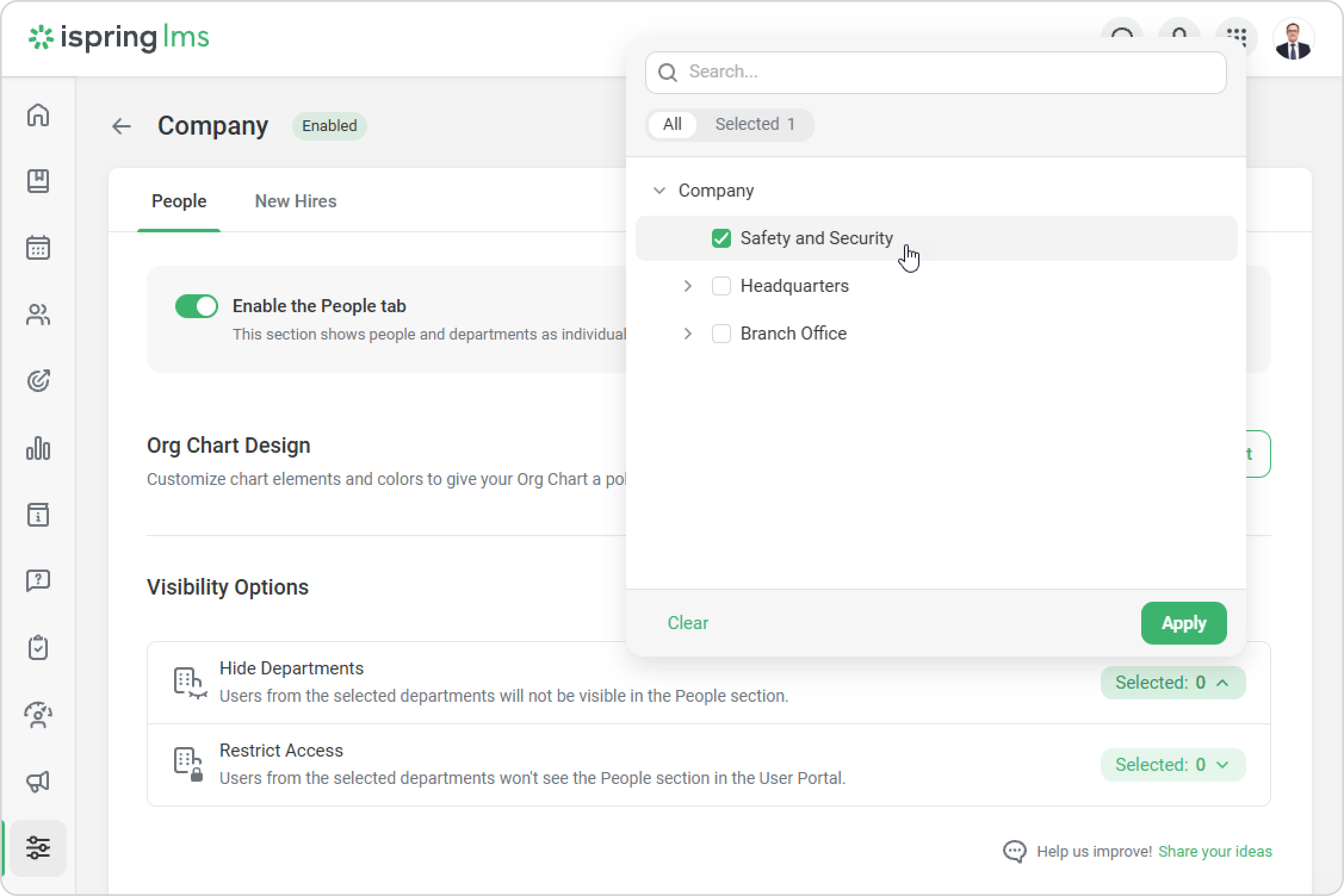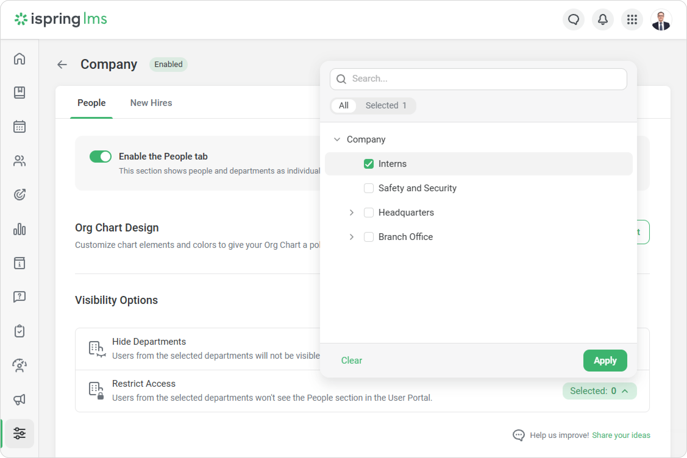 Done! Interns will not see Org Chart in the iSpring LMS User Portal.