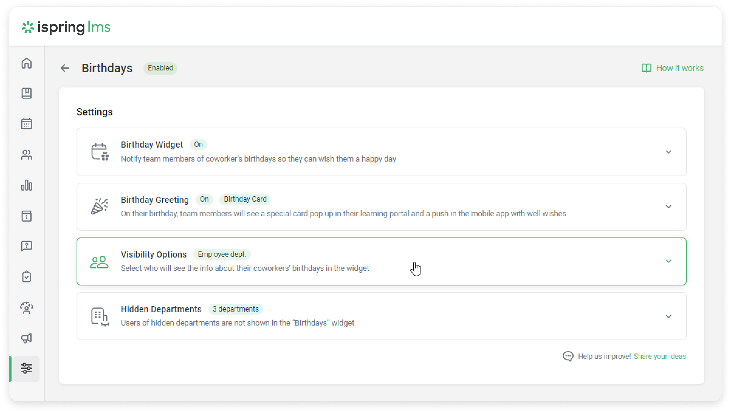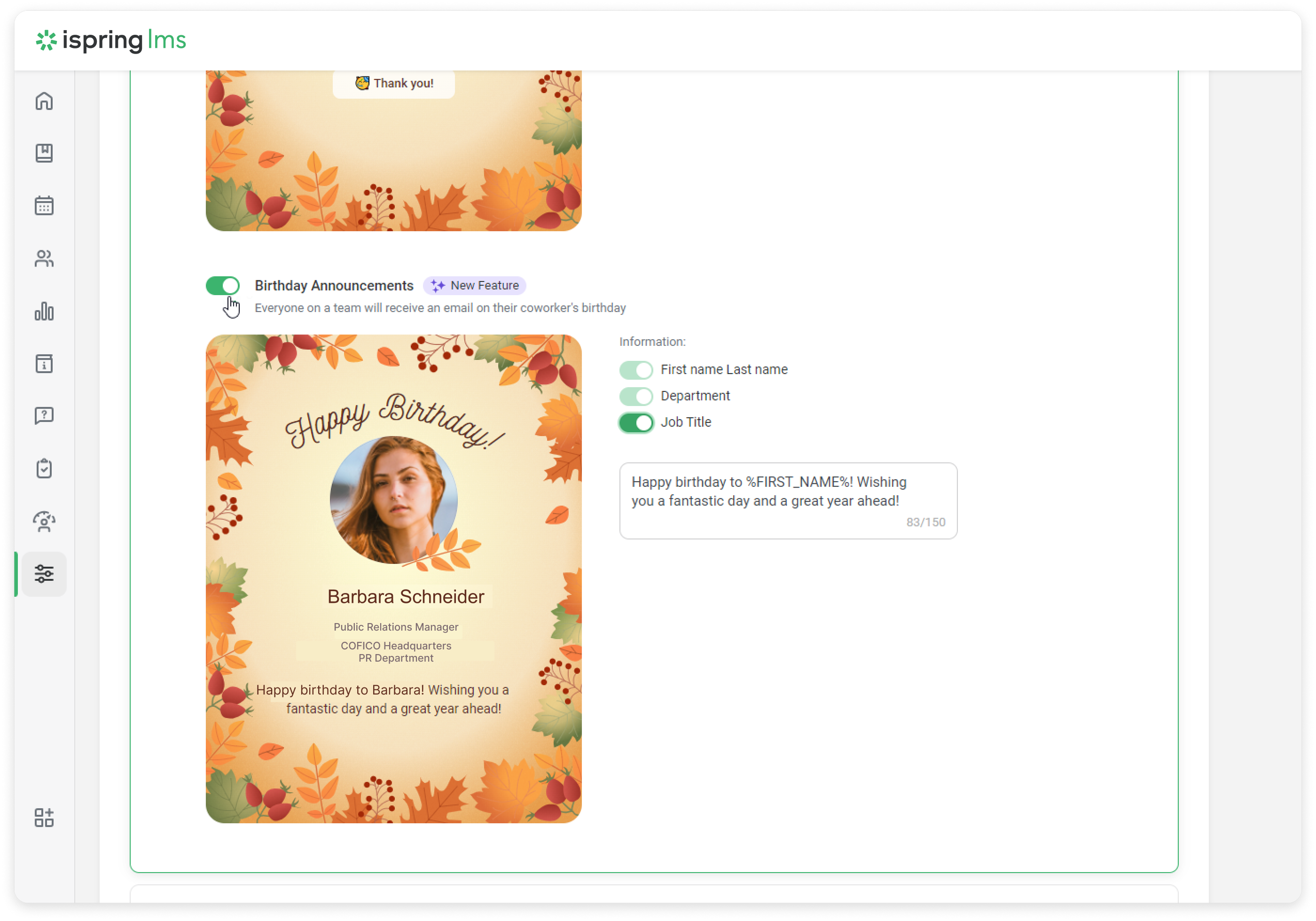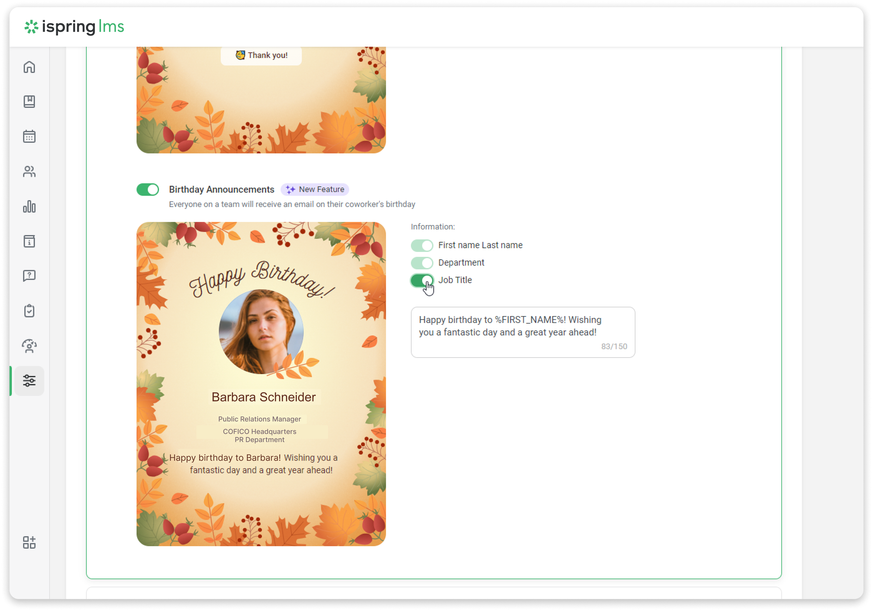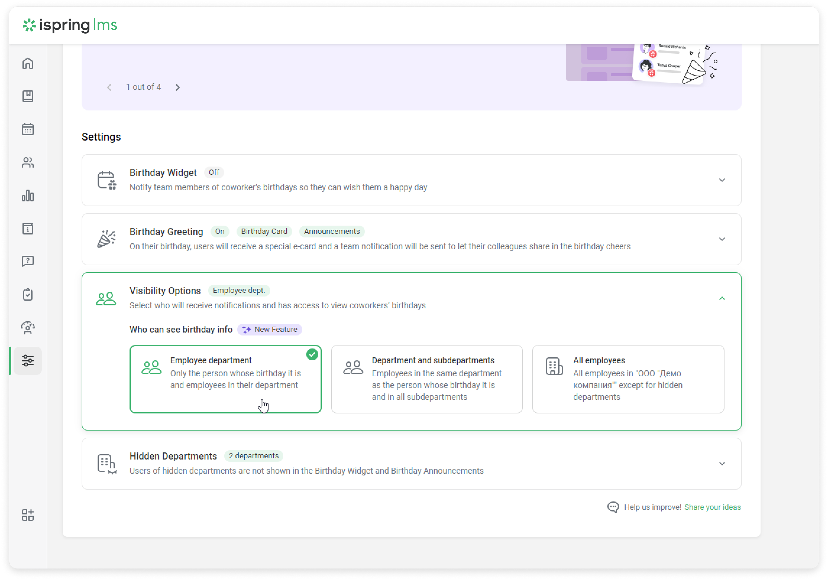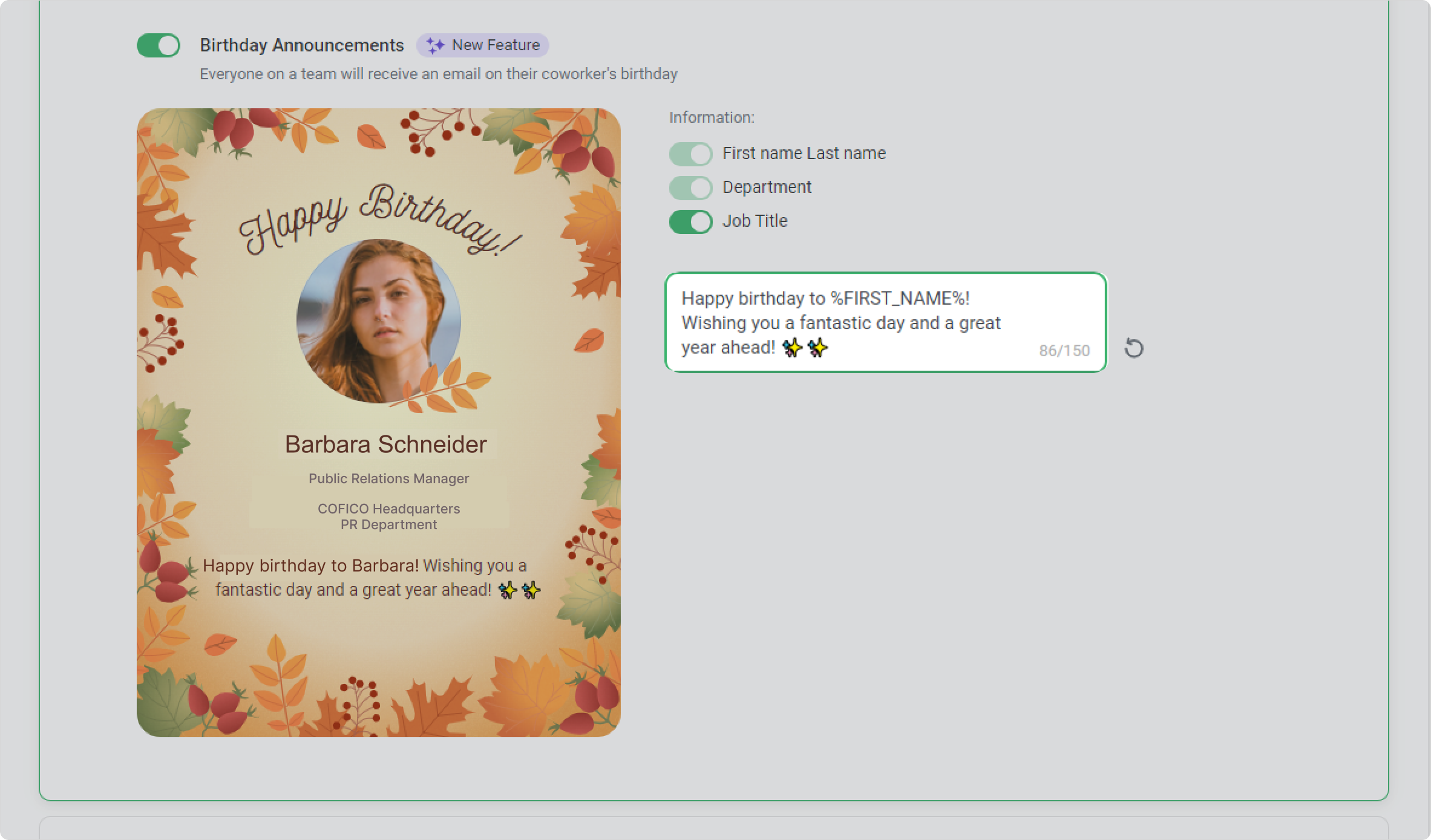Both the birthday celebrant and their co-workers will receive emails according to the visibility options. Users from hidden departments won't receive birthday announcements.