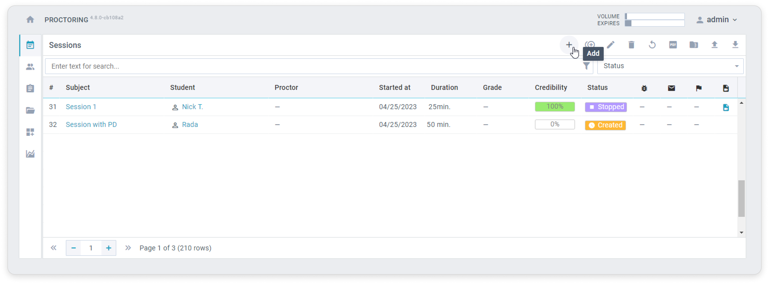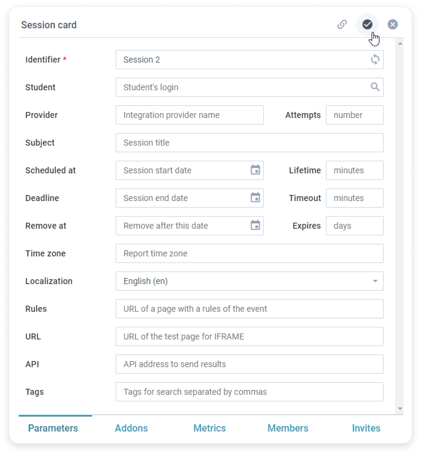 iSpring LMS Services Integrations OctoProctor Current: How to Set Up OctoProctor How to Set Up OctoProctor Before connecting this integration to iSpring LMS, you’ll need to create a session in OctoProctor. Let's see how to create a session with a proctor.How to Create a Proctor RoleGo to the Users section and click on the icon.In the user profile, fill in the fields and create a username and password. Done! You’ve added a proctor.How to Create a Proctoring SessionGo to the Sessions section and click on the icon.Enter the name of the session in the ID field. Later, you’ll use the session name when enabling the integration in iSpring LMS.Next, go to the Addons tab and select what the user should check and provide before testing, such as a photo of their passport.Then, add a proctor in the Members section. In the search field, enter the proctor's log-in and click on the icon.When everything has been filled in, click on the icon.Perfect! You’ve created a proctoring session in OctoProctor. ×