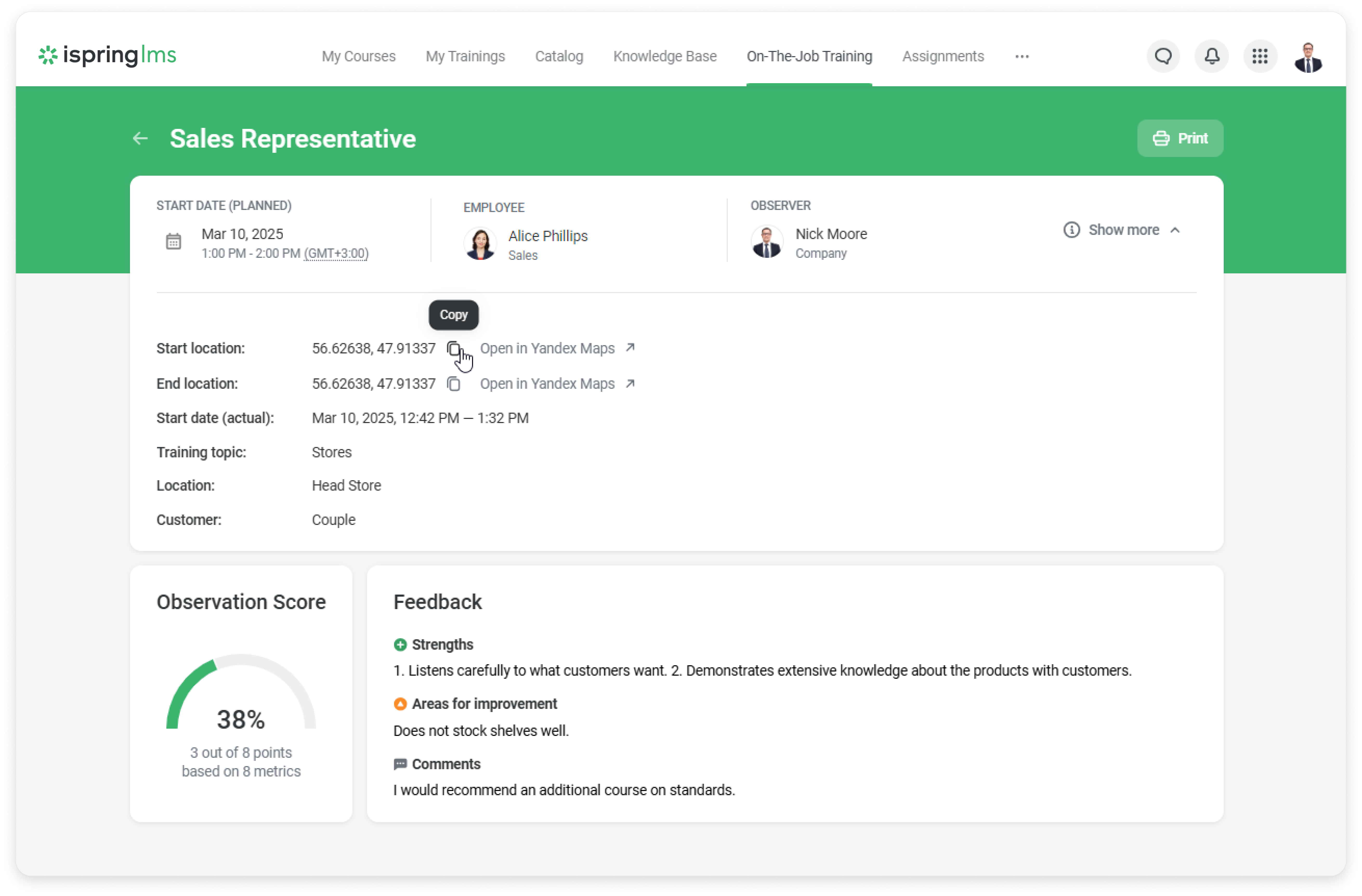 - You will see a detailed session report. You can print out the observation checklist and use the paper version.