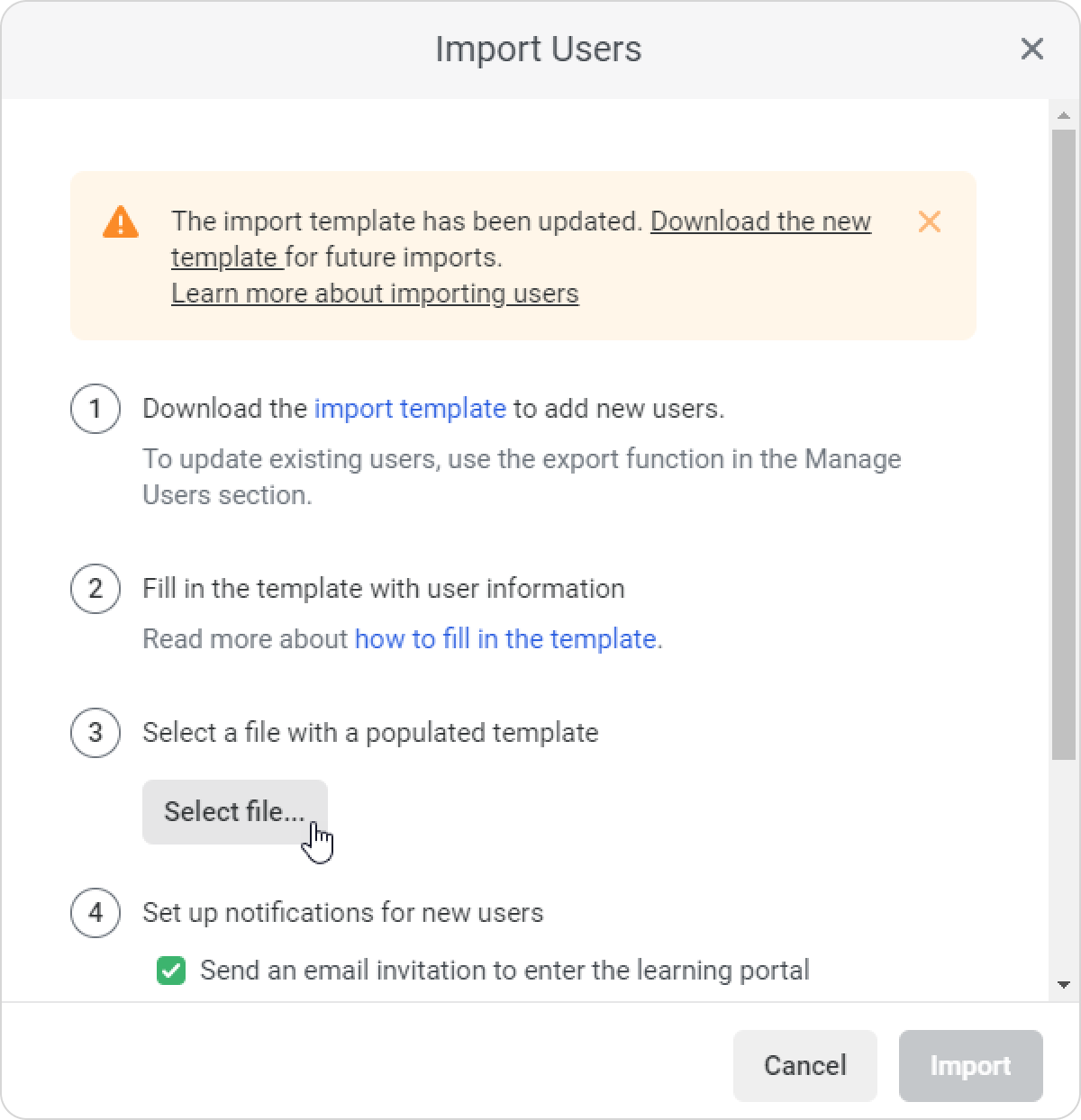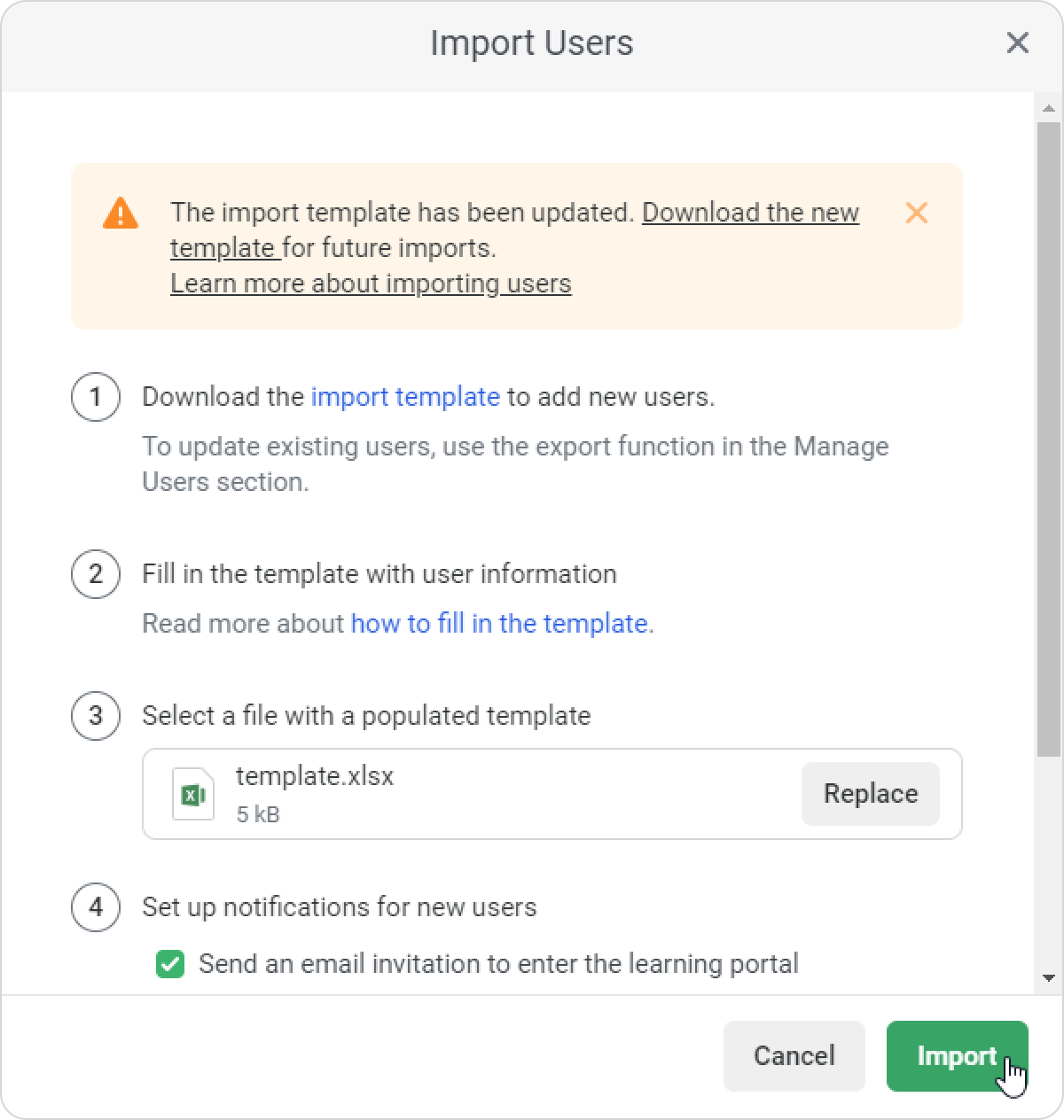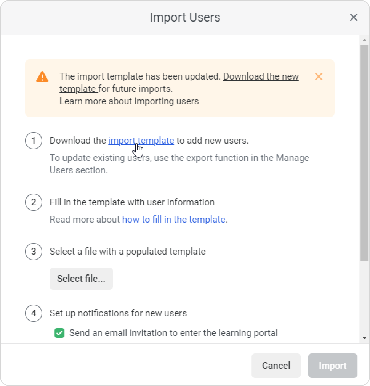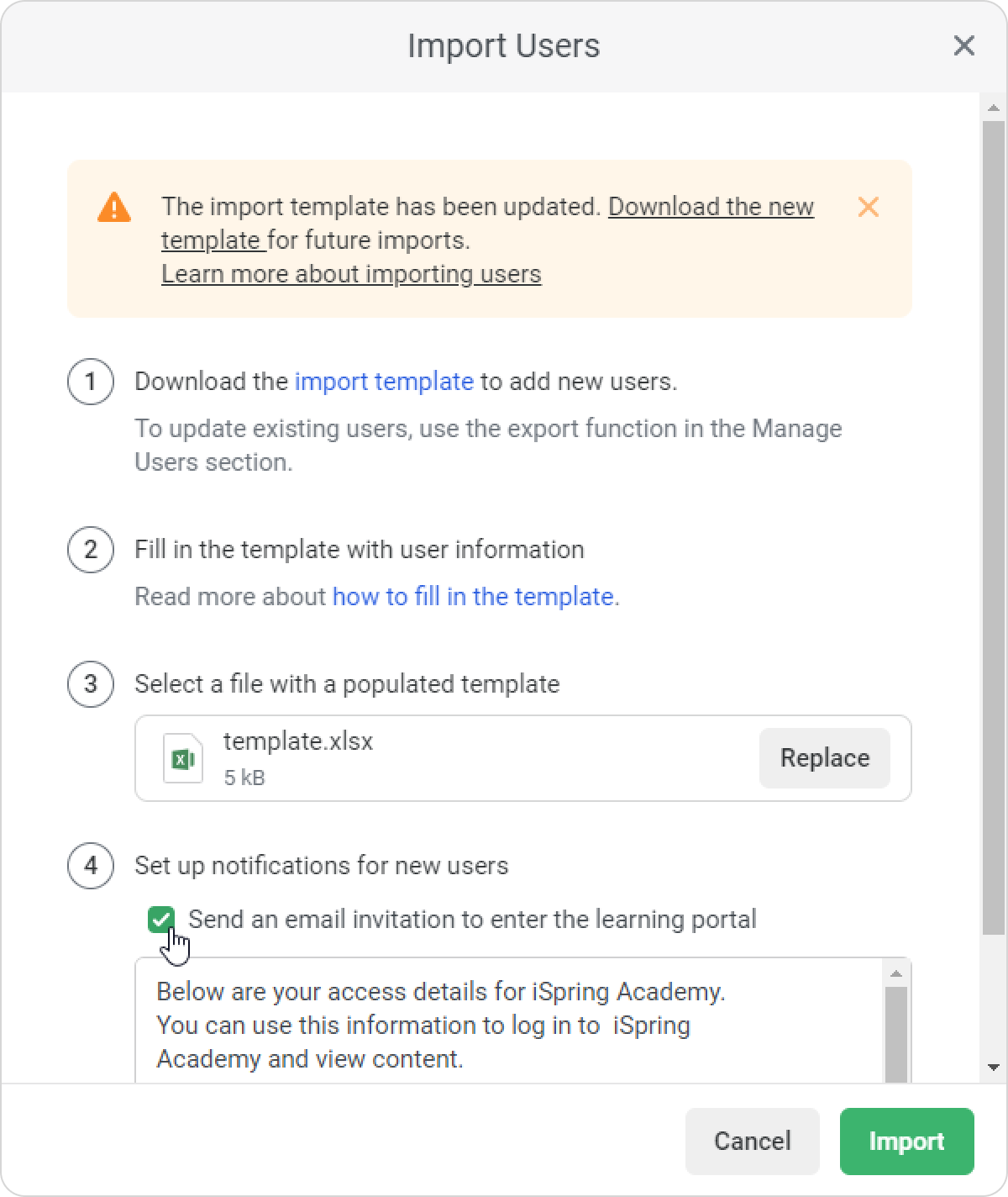 - Add an invitation message for the imported users. To do this, select Send an email invitation to enter the learning portal and modify the message as you wish.